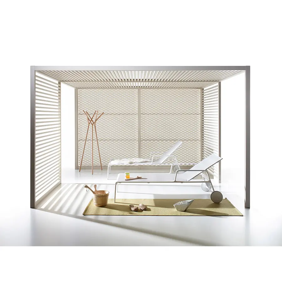 Monica Armani moderniza la clásica cama de columnas, dándole una silueta geométrica en aluminio con lacado en polvo. El sofá cama se puede configurar completamente a su gusto. Así, por ejemplo, puede elegir el panel posterior y la cubierta de aluminio o en listones de madera de teca, o en tela Sunvision deslizante, un tipo de tejido patentado que filtra los rayos solares sin bloquear la luz.