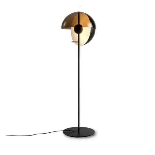 Theia has two sides; to discover them, simply rotate it gently on its axis. It can be directed towards the user and functions as a reading lamp. This rotation completely changes the perception of the piece, as its metallic diffuser is entirely opaque. Its formal design is elemental and minimalist: two hemispheres, one horizontal and the other vertical, intersecting each other. These basic forms, like those found in nature, allow light from a source to be projected, reflected, and absorbed by objects, to the delight of our eyes. Base and stem made of lacquered iron. Heat sink in lacquered aluminum with integrated switch. Vertical hemisphere of lacquered cast iron, with a white interior, and a transparent smoked thermoformed methacrylate shade. Available in white and black.