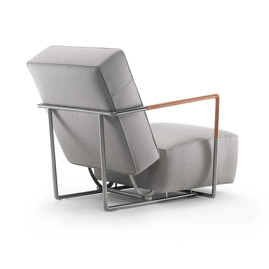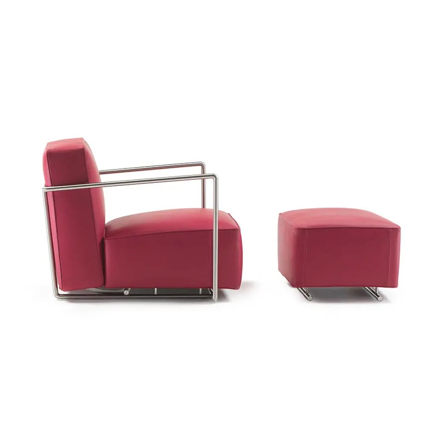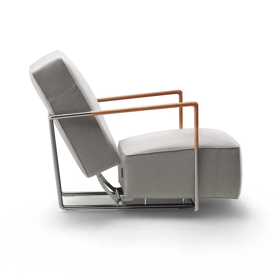El concepto del sillón A.B.C. recuerda al peculiar lenguaje de diseño del Movimiento Moderno, evidente tanto en el uso de la piel negra como como en la estructura tubular metálica. En cambio, es absolutamente contemporáneo el asiento de baja altura, que se integra perfectamente con los volúmenes tapizados dentro de la estructura tubular metálica, disponible en los acabados cromado, satinado, bruñido, cromado negro y champán. El sillón A.B.C. puede combinarse con el pouf del mismo nombre y está equipado con un sofisticado mecanismo para reclinar el respaldo. La tapicería –completamente desenfundable– se puede realizar en todos los tejidos y pieles de la exclusiva colección Flexform. El sillón A.B.C. también está disponible con reposabrazos recubiertos de cuero.