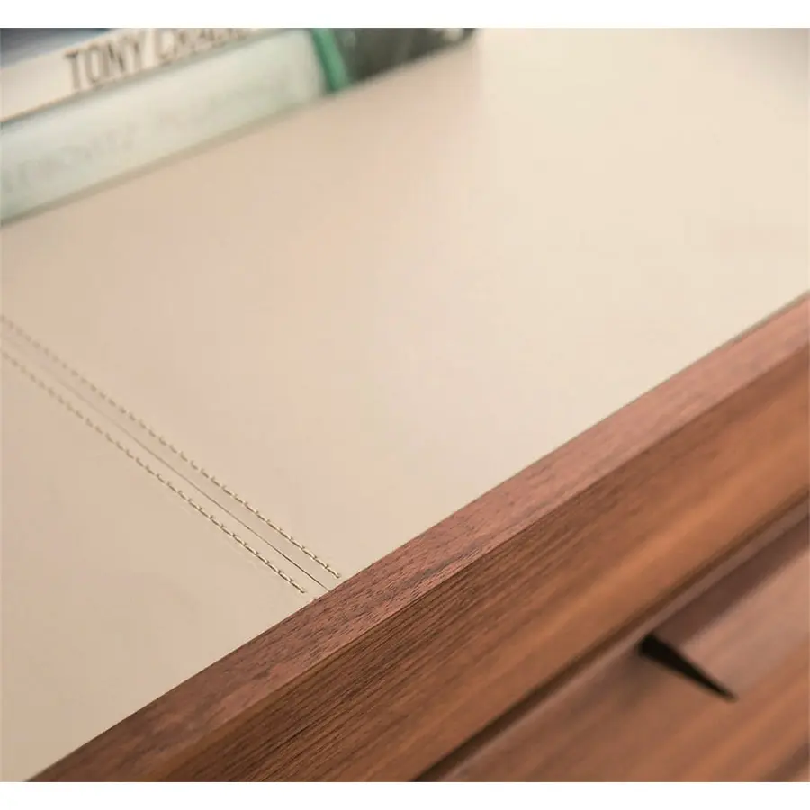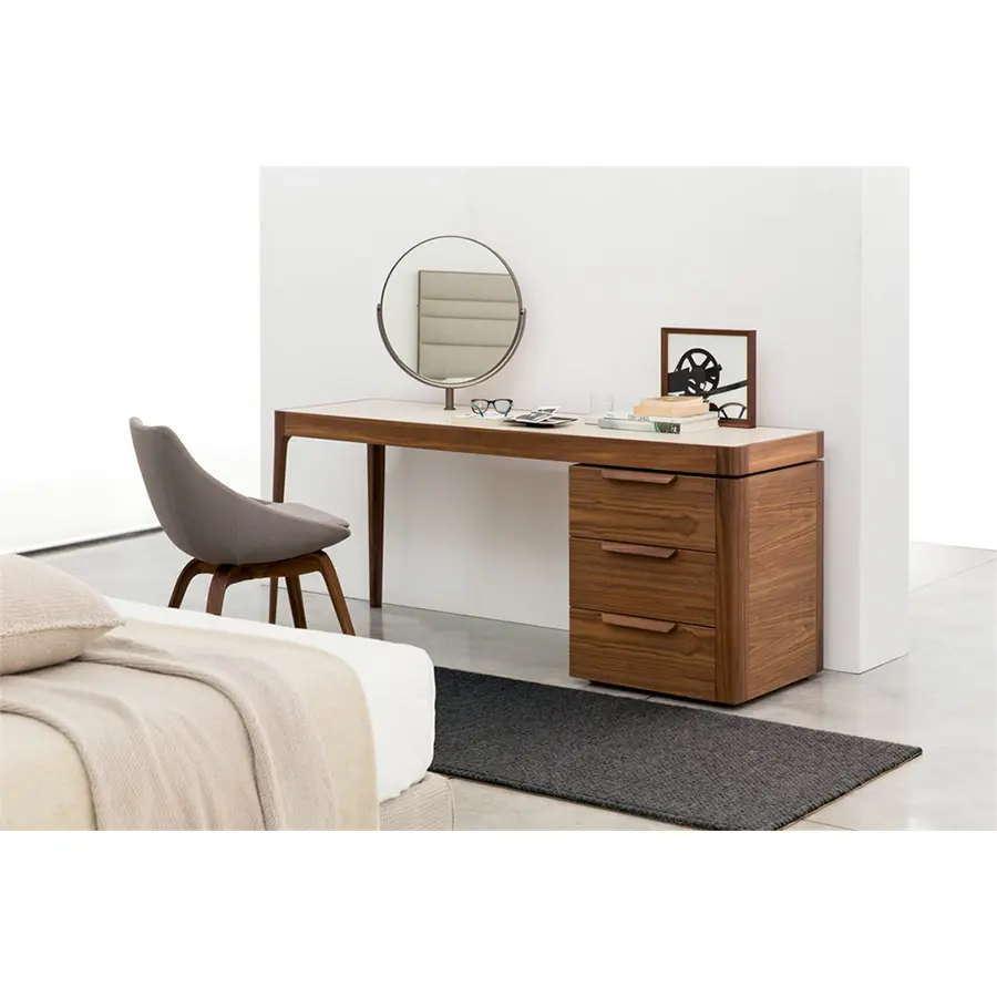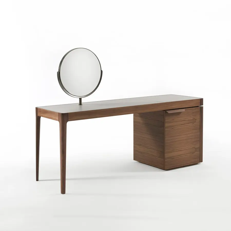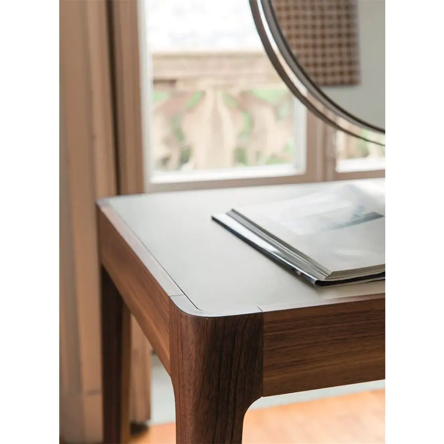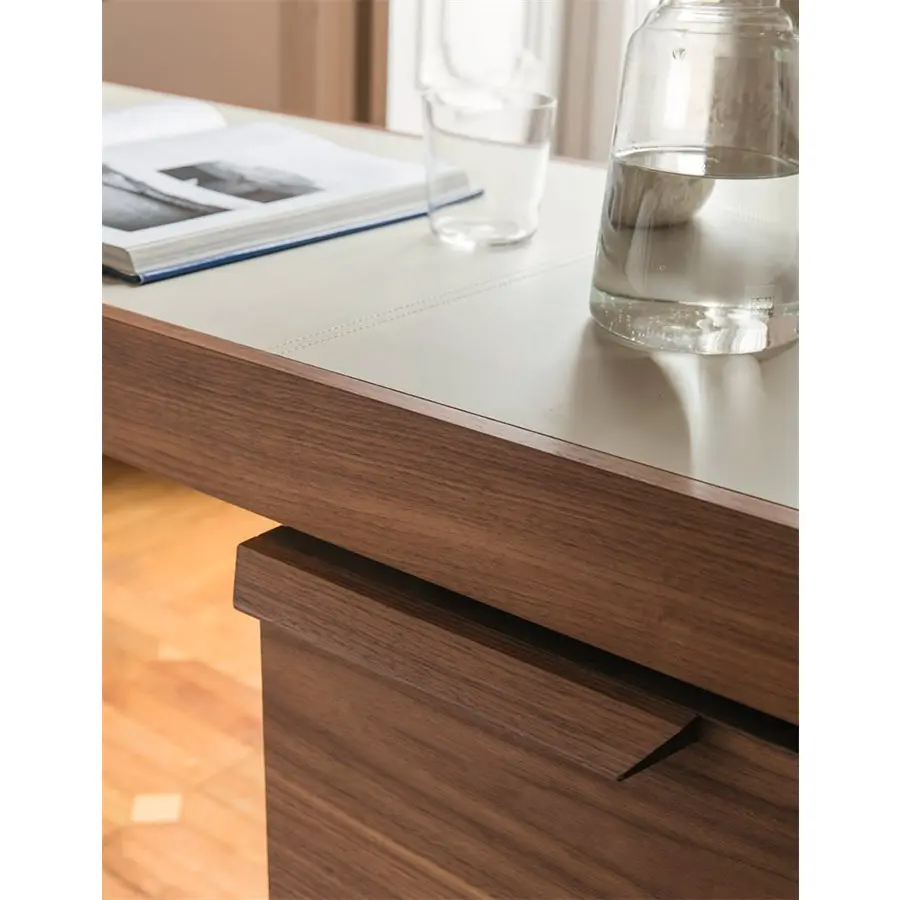 Escritorio con estructura en nogal canaletta macizo y elemento lateral con tres cajones. Tapa realizada en madera, en cuoietto, en mármol o en cristal. Posibilidad de añadir un elemento en espejo en la versión con tapa en madera y en cuoietto. Las dimensiones son de 182x59x75