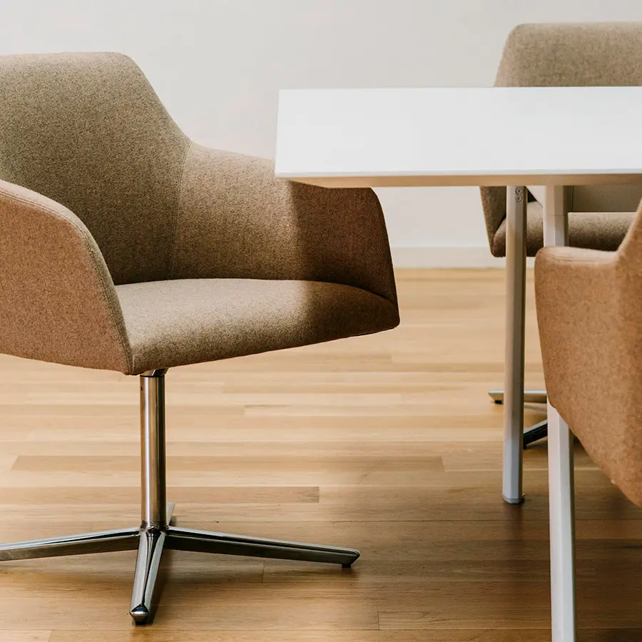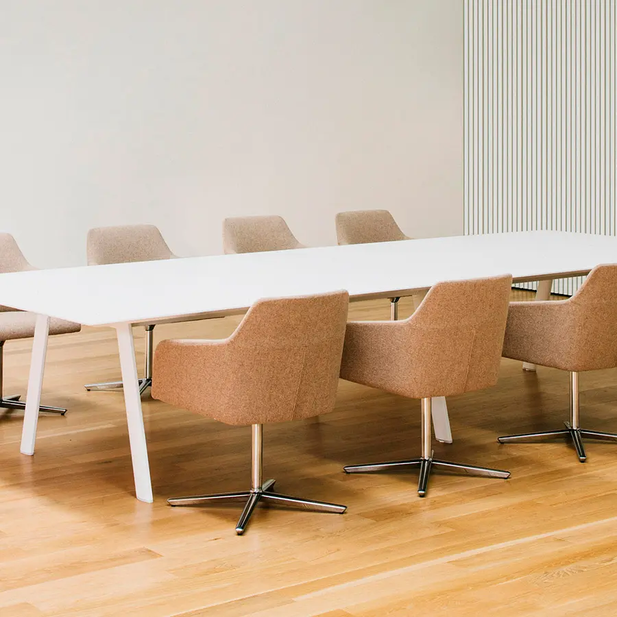 Butaca de respaldo bajo con asiento y respaldo tapizado y base central giratoria de 4 aspas de aluminio con sistema de retorno y acabado aluminio pulido.