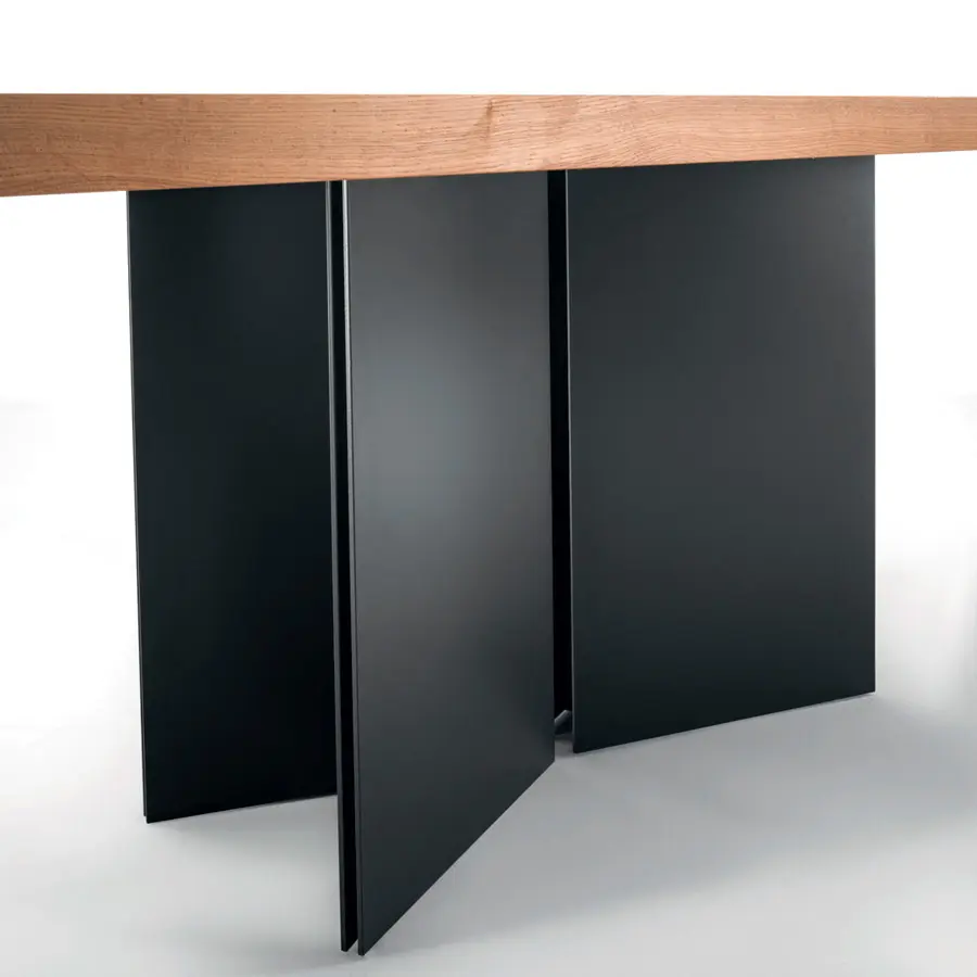 Mesa con sobre de listones encolados, con cámara de aire y laterales rectos. Base en chapa de hierro caracterizada por líneas geométricas.