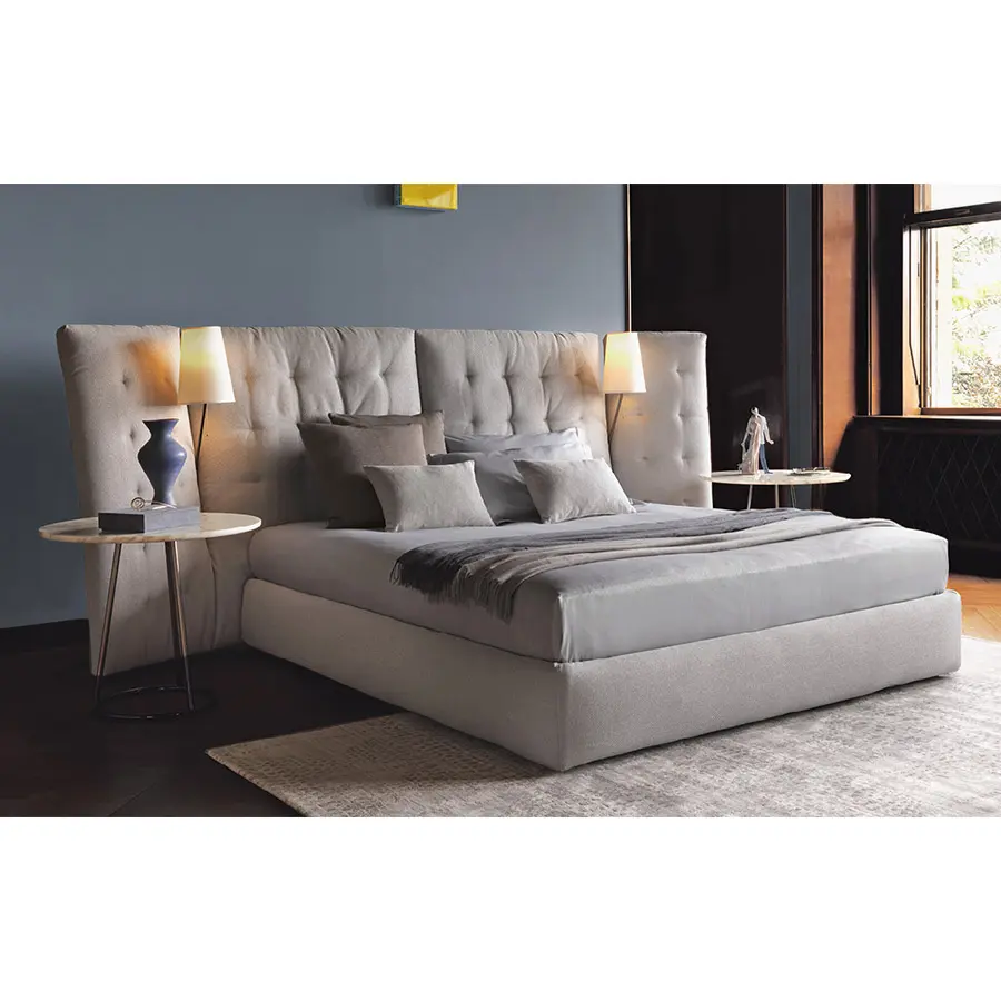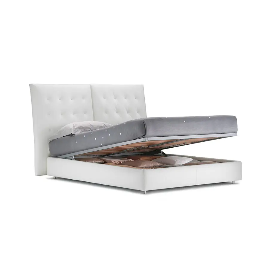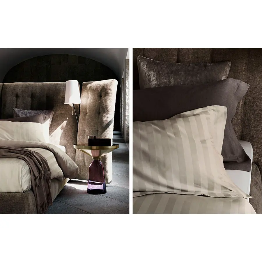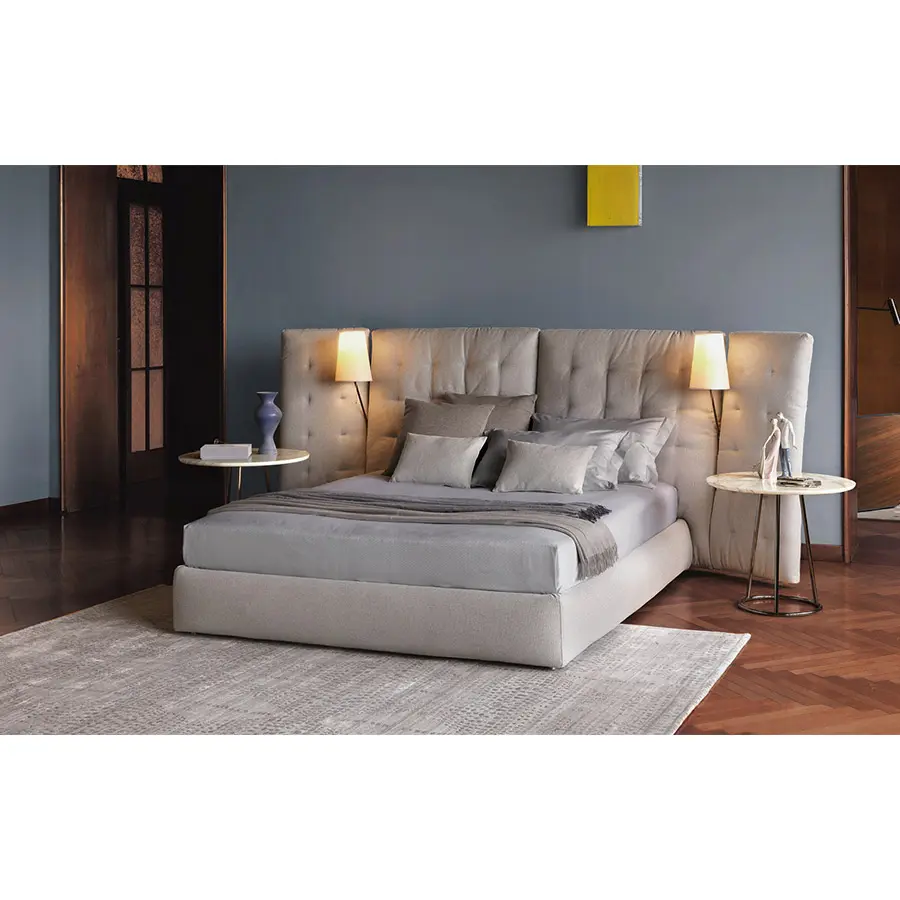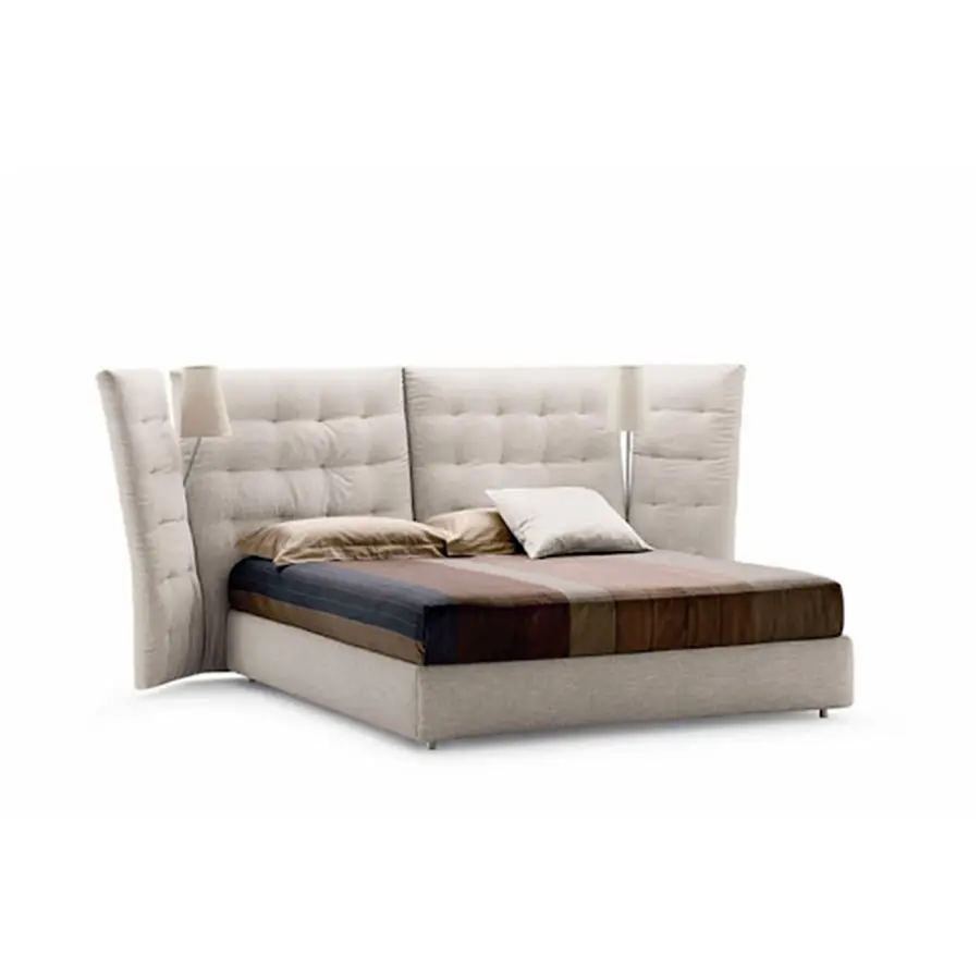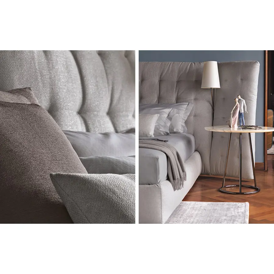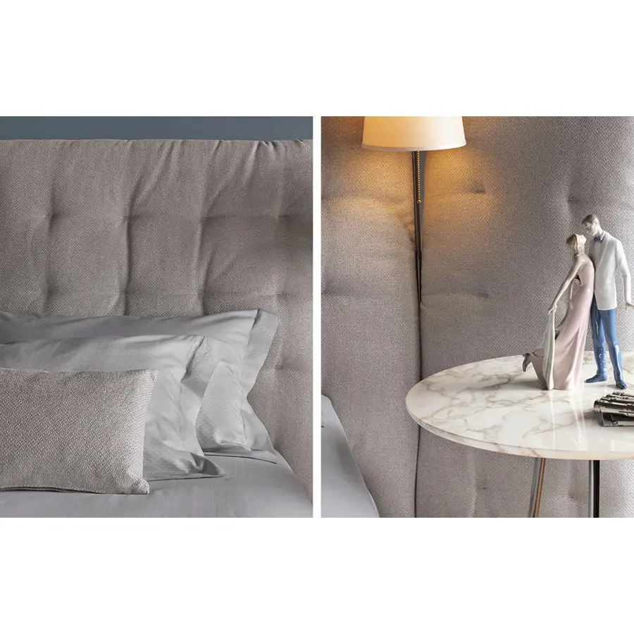 Cama matrimonial con una línea importante, propuesta en las versiones con cabecera simple o enriquecida por dos paneles laterales. Cabecera acolchada en versión capitonné, con revestimiento totalmente desenfundable en tejido o piel. Disponible con base de muelles Leonardo, base fija h 25 cm, base contenedor o base con movimiento eléctrico. En la intersección entre cabecera y paneles laterales Angle puede equiparse con dos lámparas Angle con estructura en tubular cromado brillo, dorado o bronce.