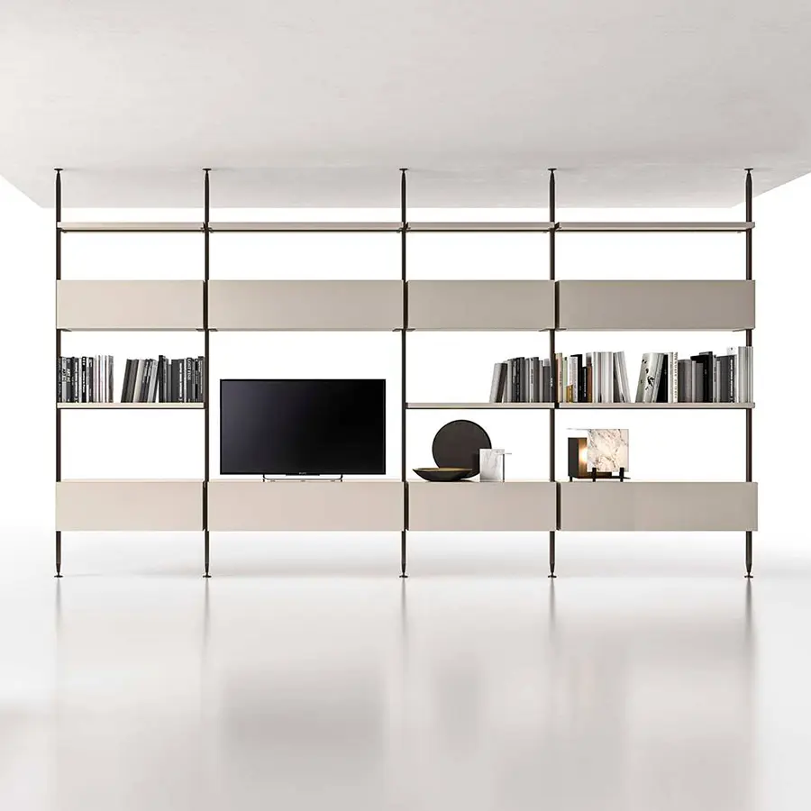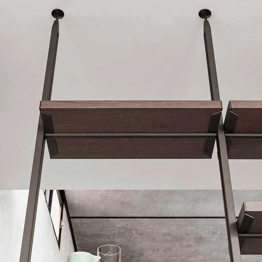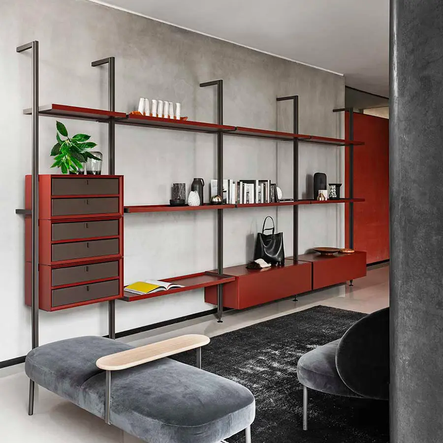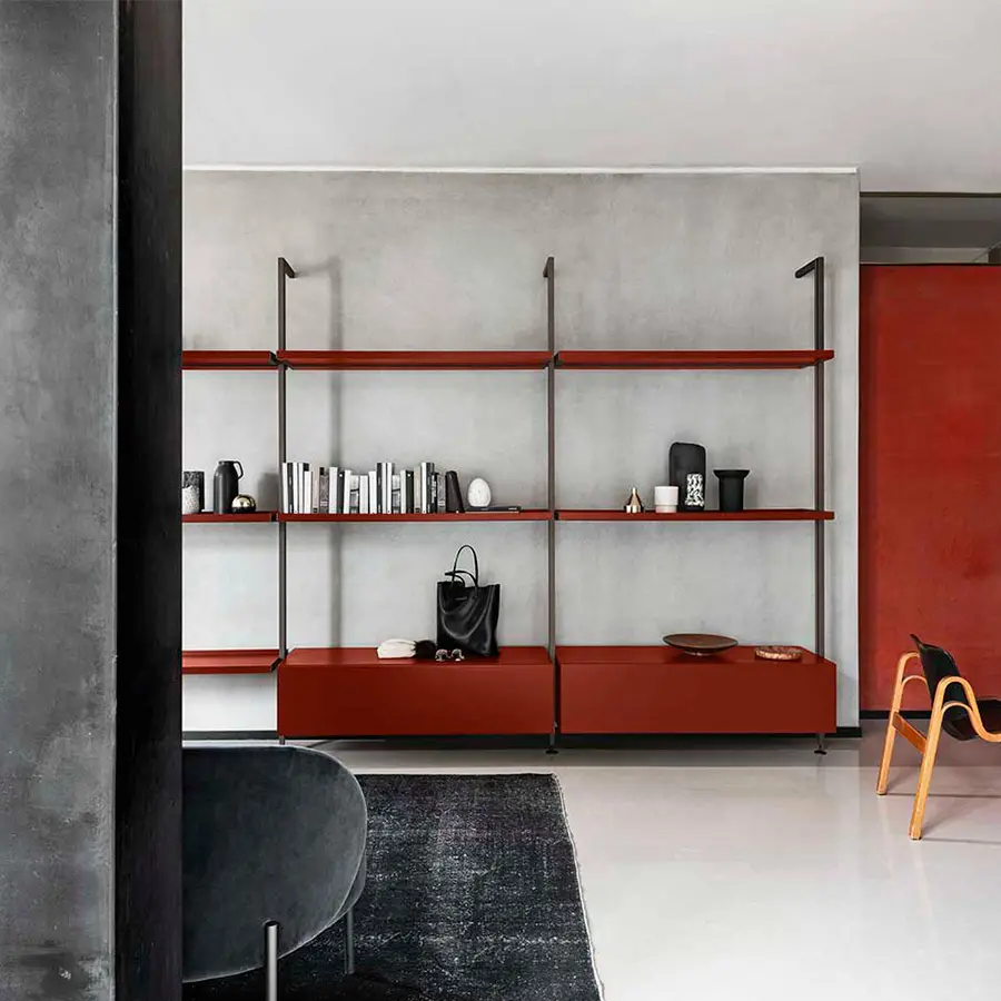 Lo verdaderamente importante de la librería es el sistema de enganche de los elementos, exclusivo y sencillo, gracias al montante de aluminio sin agujeros ni enganches prefjados, que permite cambiar de posición los elementos más adelante.