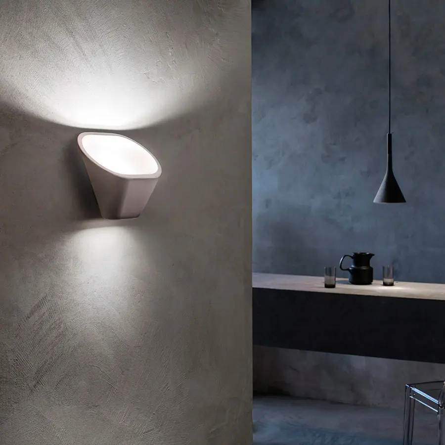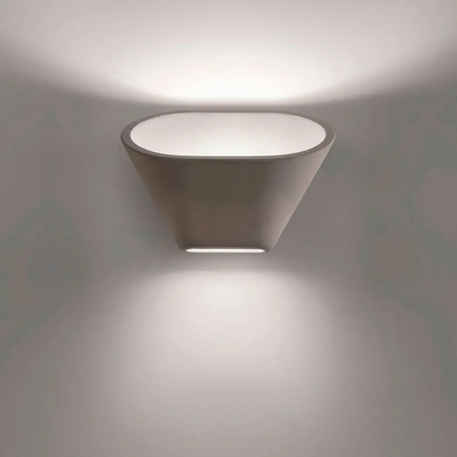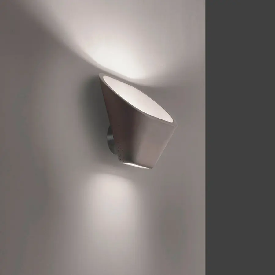 Aplomb pared es una exploración de las posibilidades expresivas del cemento puro, fluidificado en el molde y emocionante a la vista y al tacto, gracias a su amalgama especial. Como el original modelo de suspensión, Aplomb pared efectúa un salto dimensional: del mundo de la arquitectura y de la construcción (que recuerda su materia prima) a una lámpara para ambientes domésticos. Con su forma oblicua, el difusor se integra, comunica con la pared de soporte y permite una difusión más amplia de la luz. El cemento escuda completamente la luz, pero sale tanto por la gran apertura superior como por la inferior, más pequeña. El haz luminoso dirigido hacia arriba se refleja en la pared y en el techo, iluminando intensamente el ambiente sin deslumbrar nunca. El haz luminoso más delicado dirigido hacia abajo crea en cambio un refinado juego de luz de pared. Se encuentra disponible en gris, un color que destaca su matericidad, en un elegante blanco y un cálido tono marrón. Es perfecta en todos los ambientes que hablan un lenguaje arquitectónico directo y esencial, utilizada individualmente o en secuencias con perspectivas a lo largo de una pared o un pasillo.