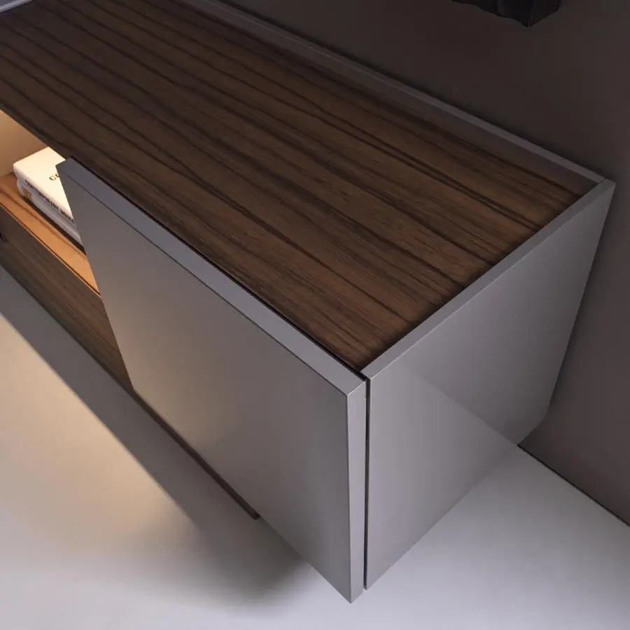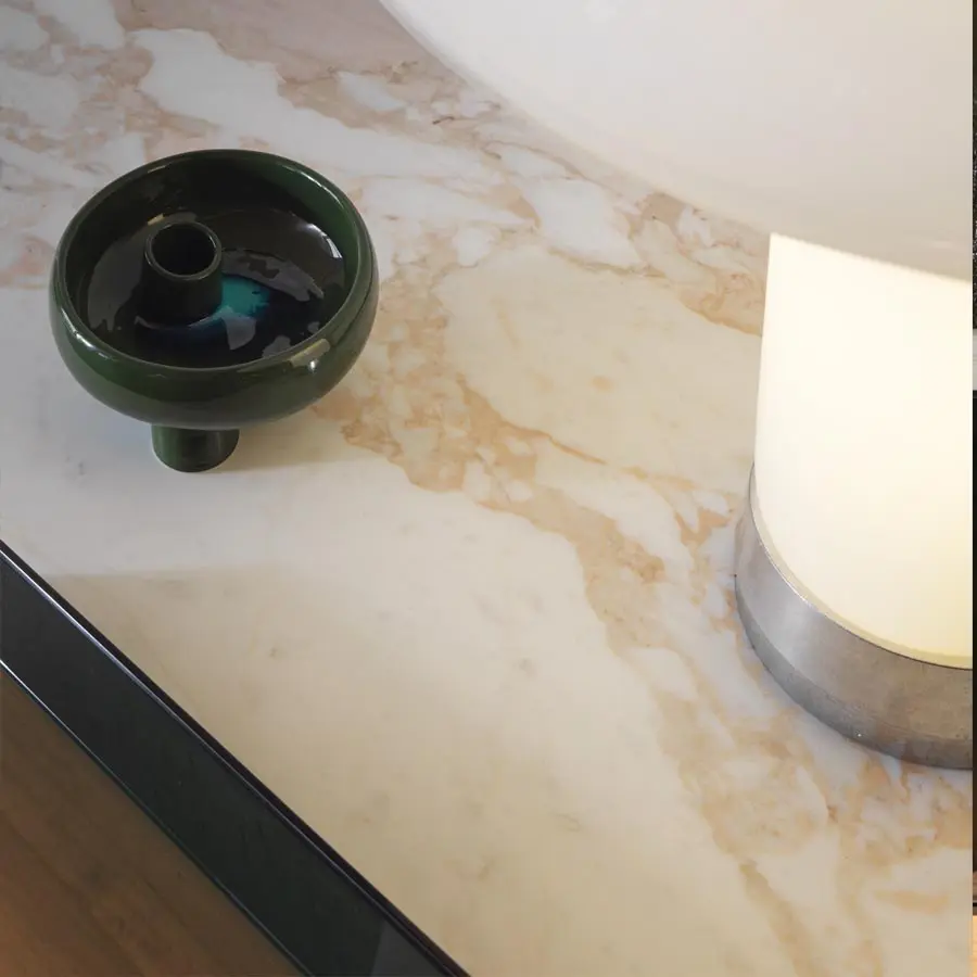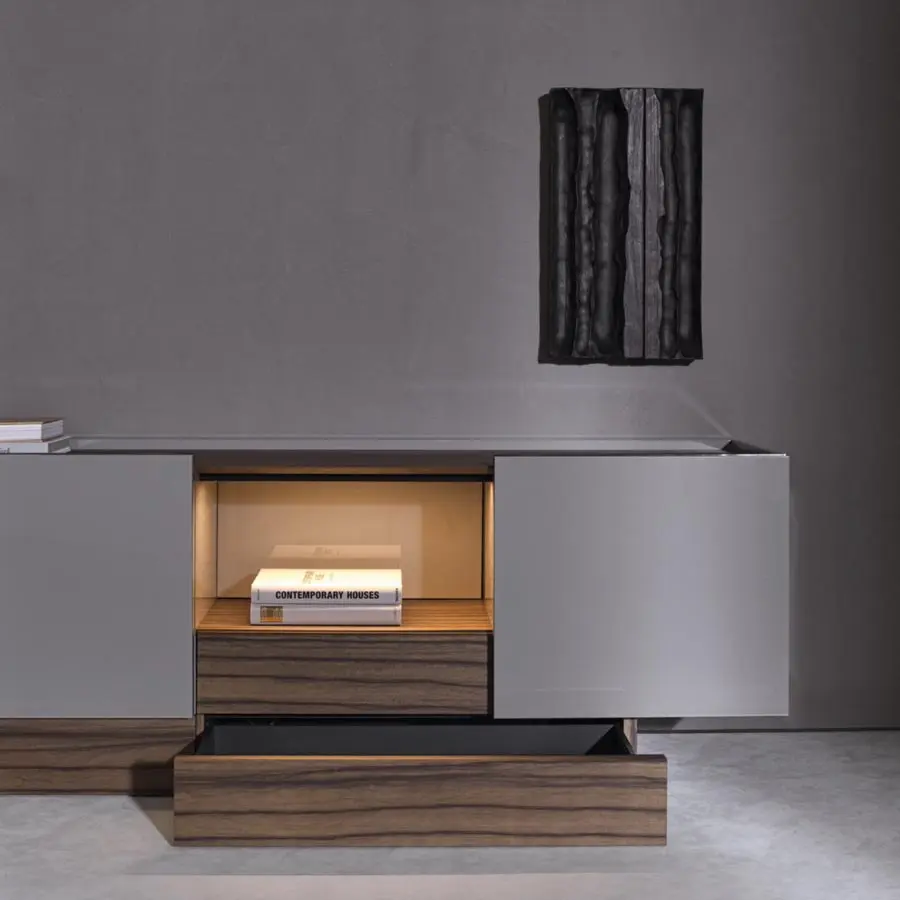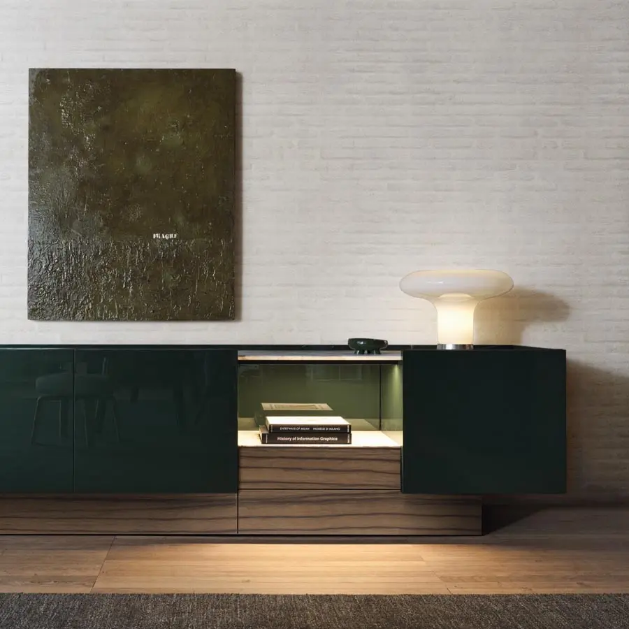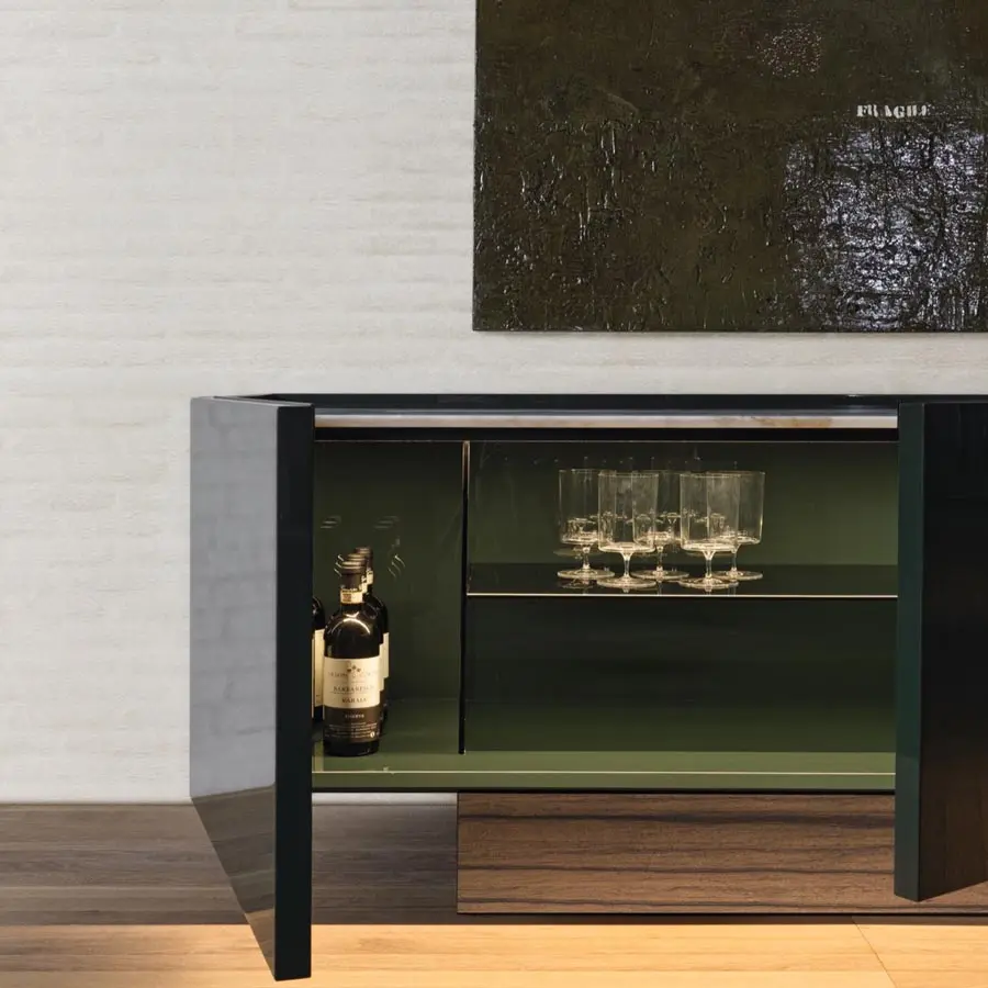 Esta pieza debe su llamativa forma a una silueta estilizada y moderna. Las superficies exteriores se enriquecen con un acabado lacado brillante, mientras que la parte superior se puede personalizar con mármol o madera. La puerta está embellecida por un perfil metálico ligeramente abombado con respecto a la parte superior, que perfila el pomo con un trazo marcado. En el centro, un espacio abierto con un cajón proporciona un volumen central que crea la sensación de movimiento. Las líneas sobrias del aparador y el juego de volúmenes entre la estructura y las puertas le confieren un aspecto minimalista y contemporáneo.
