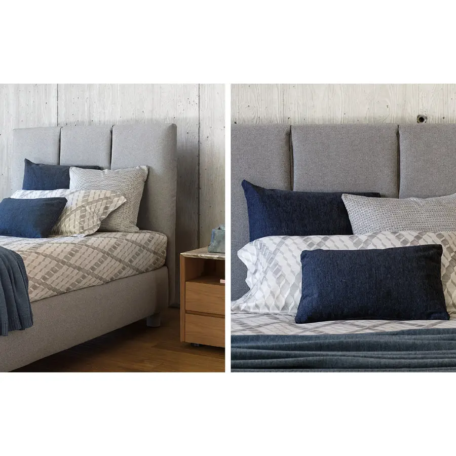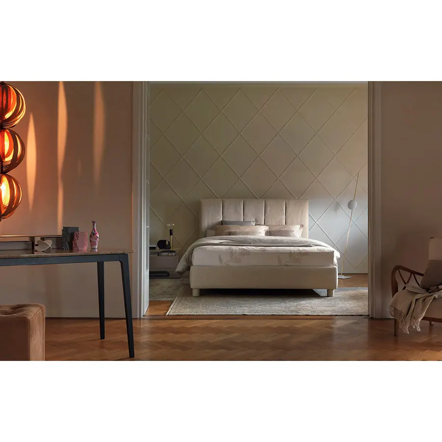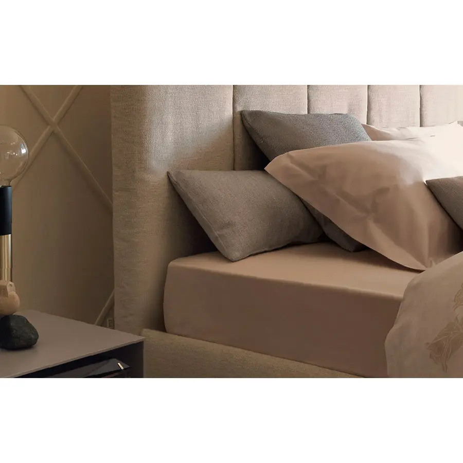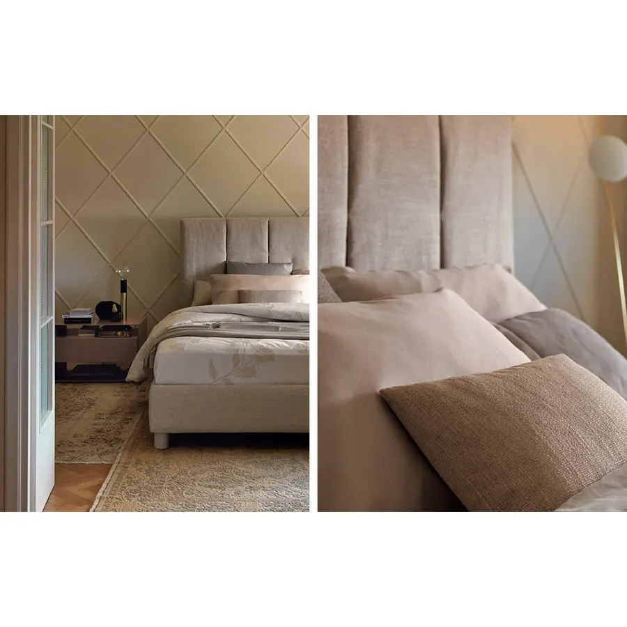 Cama de estilo contemporáneo, provista de un alto cabecero cuyo revestimiento, acoplado a un suave acolchado, está enriquecido por pliegues de fondo decorativos. Disponible con base de muelles Leonardo, base fija h 25 cm, base contenedor o base con movimiento eléctrico. Revestimiento, totalmente desenfundable, de tejido, piel o Ecopelle. Los pies cilíndricos de apoyo están disponibles tapizados en tejido, piel o Ecopelle.