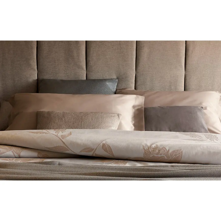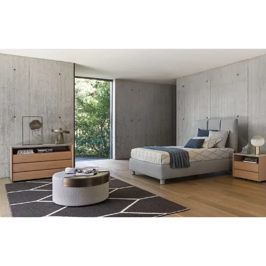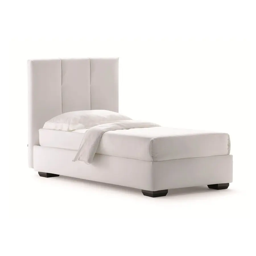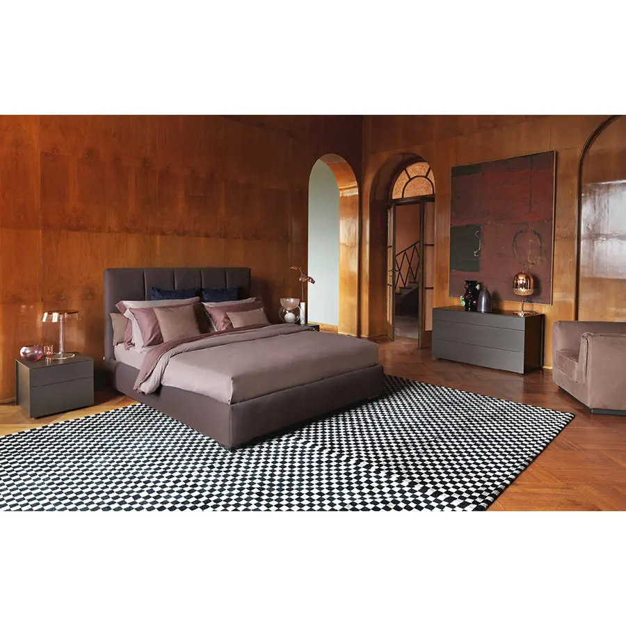 Cama de estilo contemporáneo, provista de un alto cabecero cuyo revestimiento, acoplado a un suave acolchado, está enriquecido por pliegues de fondo decorativos. Disponible con base de muelles Leonardo, base fija h 25 cm, base contenedor o base con movimiento eléctrico. Revestimiento, totalmente desenfundable, de tejido, piel o Ecopelle. Los pies cilíndricos de apoyo están disponibles tapizados en tejido, piel o Ecopelle.