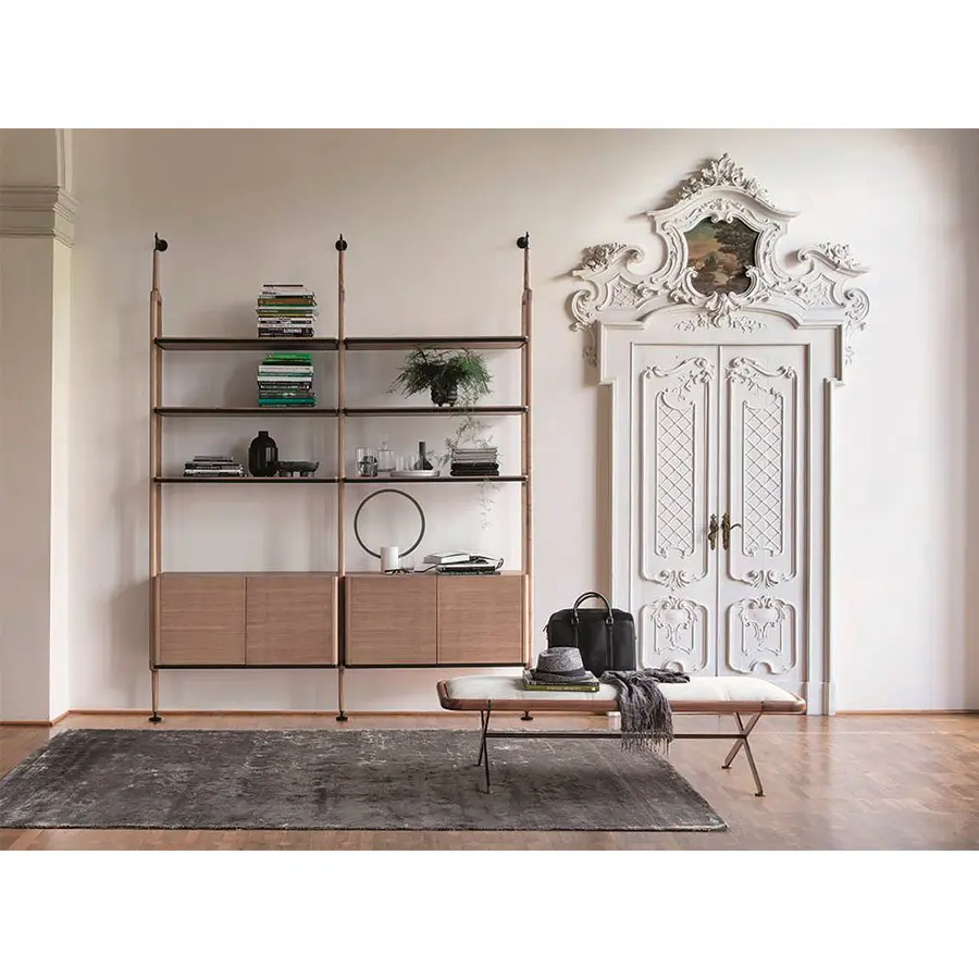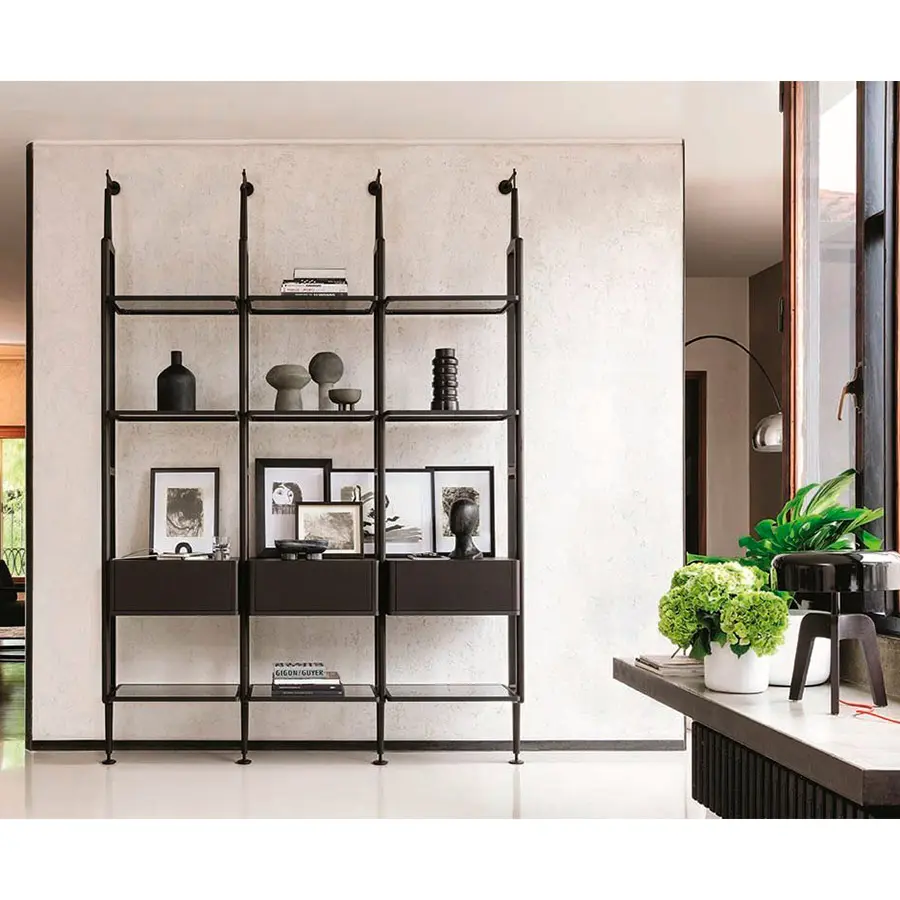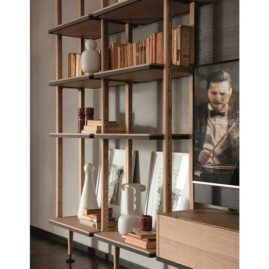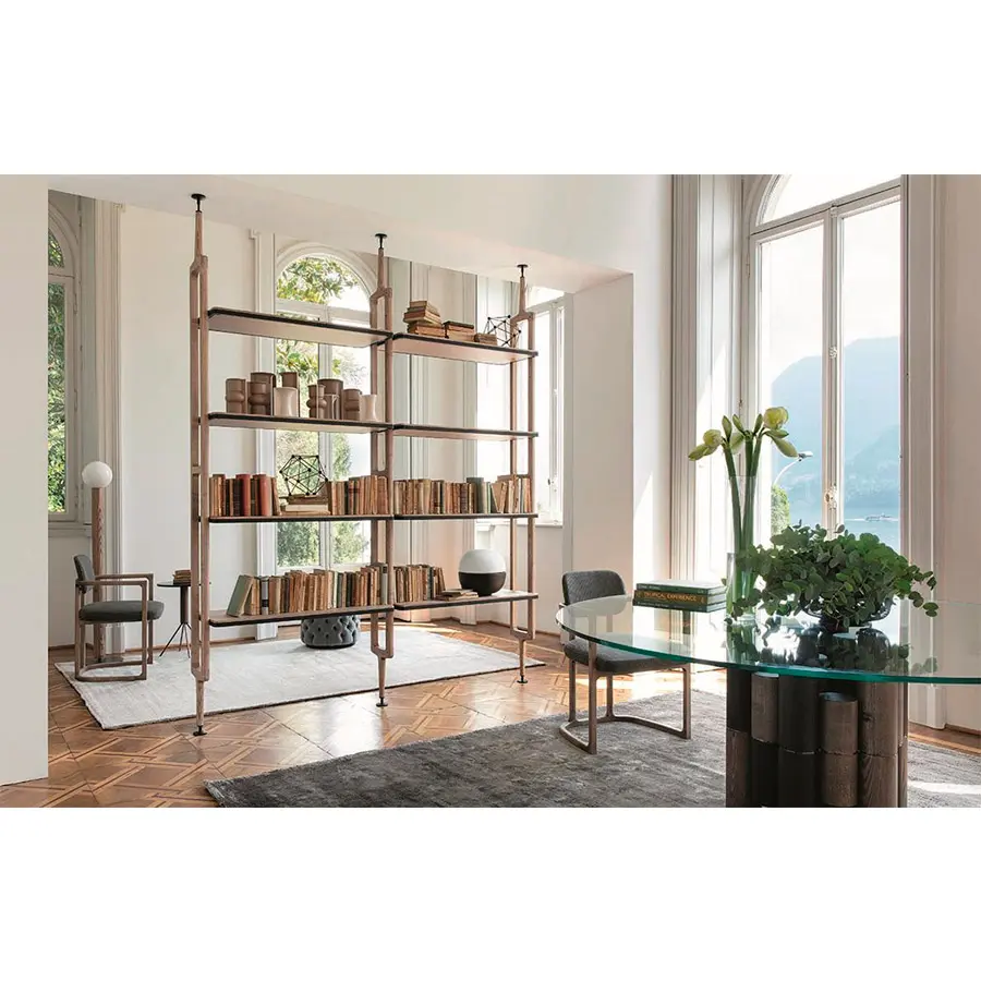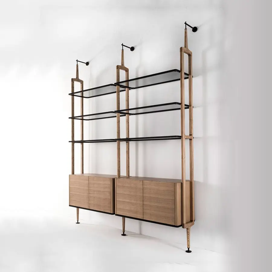 Librería modular con columnas en fresno con fijación a la pared o al techo. Es posible personalizar la composición con repisas de fresno o de cristal ahumado, cajoneras y contenedores en fresno con estructura en metal negro mate.