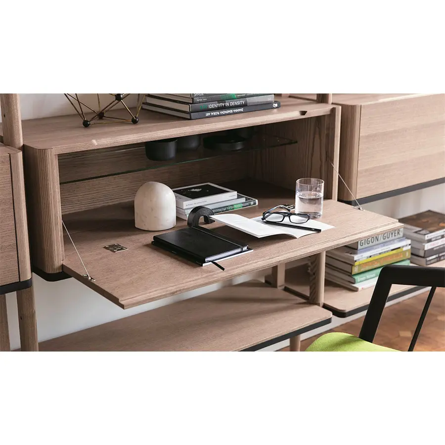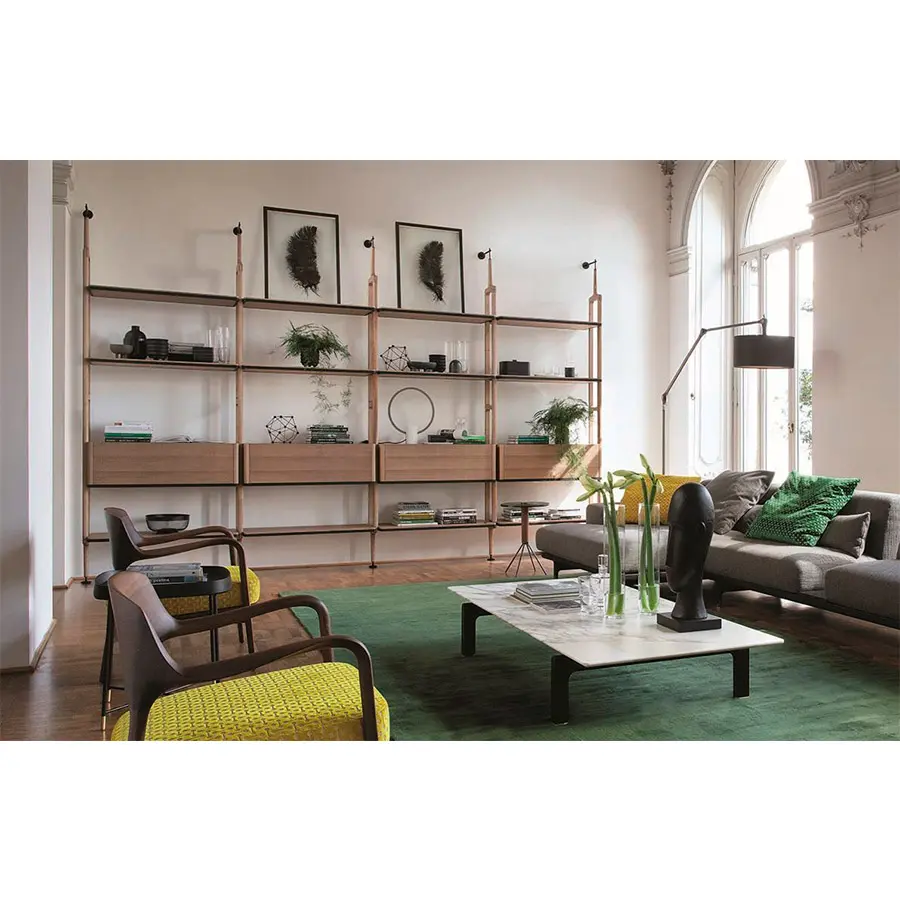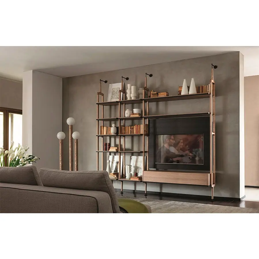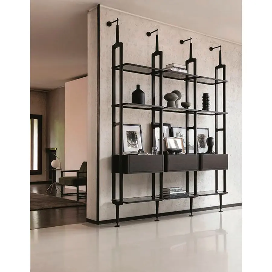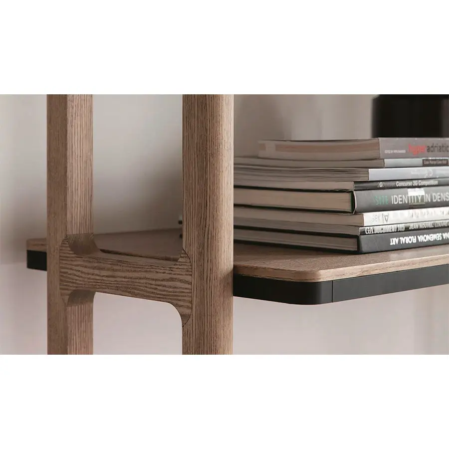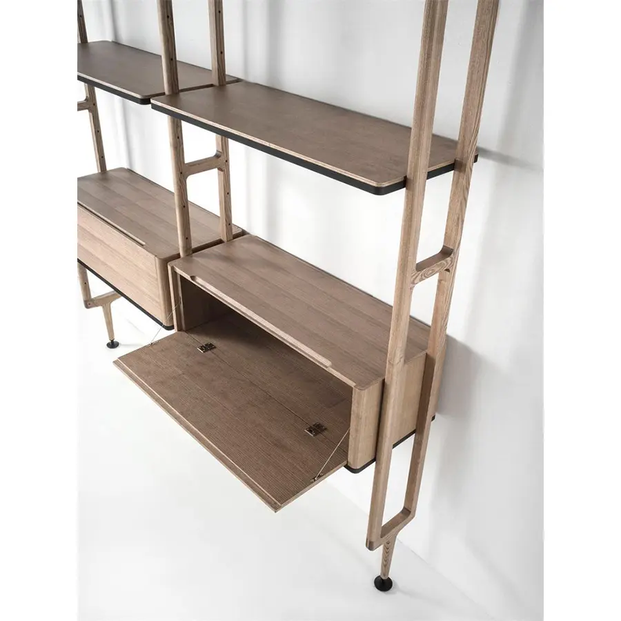 Librería modular con columnas en fresno con fijación a la pared o al techo. Es posible personalizar la composición con repisas de fresno o de cristal ahumado, cajoneras y contenedores en fresno con estructura en metal negro mate.