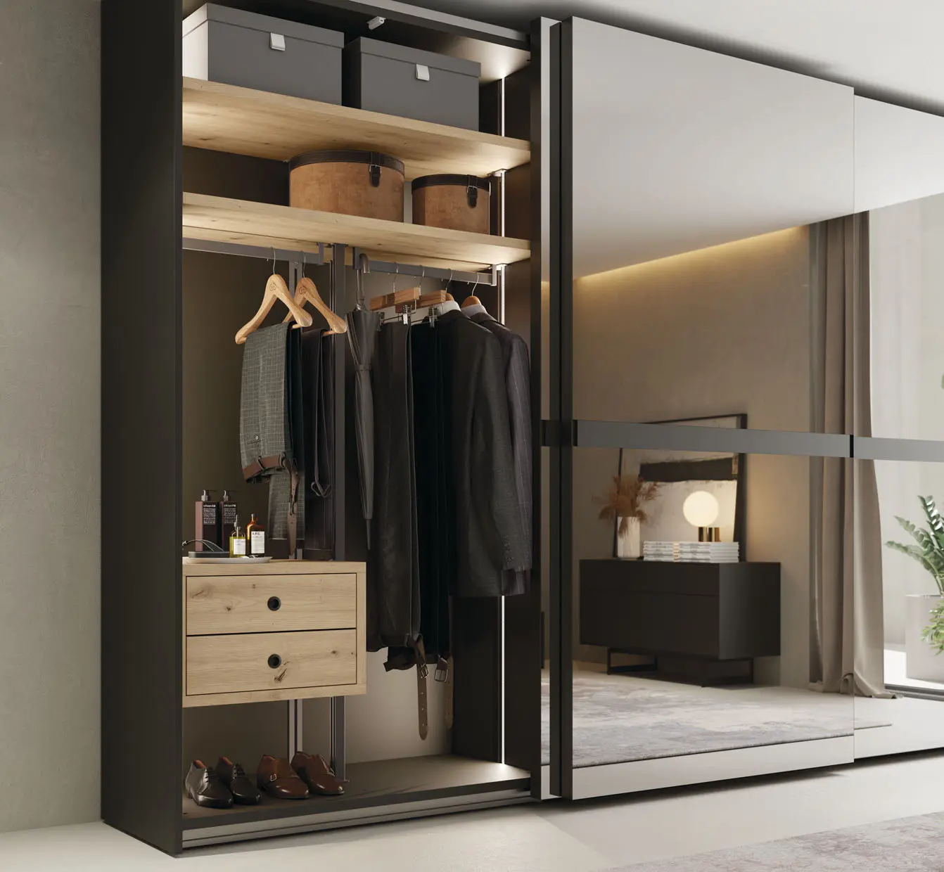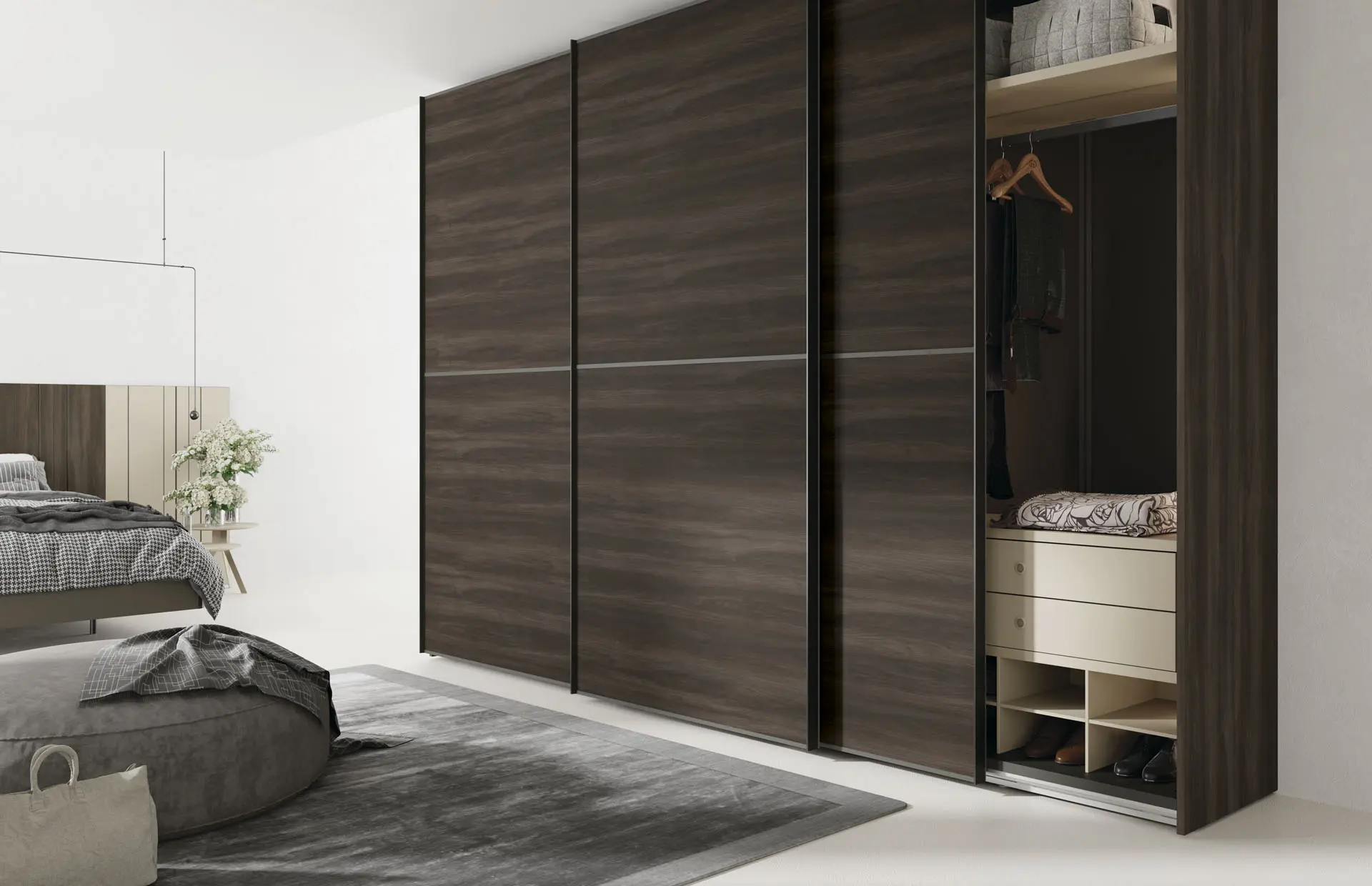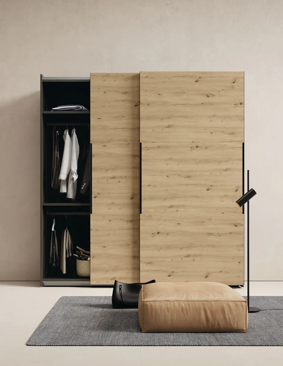 Las puertas correderas te permiten colocar la cama más cerca del armario al no necesitar espacio para abrirse. También puede ser una cuestión estética pues estas puertas acostumbran a ser más grandes por lo que dan mucha presencia. Sea cual sea el motivo tu decides si es el más adecuado para formar parte de tu habitación. Los armarios de puertas deslizantes incluyen raíles de aluminio anodizado para instalar los estantes y accesorios interiores. Estas guías metálicas permiten equipar el armario con iluminación led (opcional). Las puertas están diseñadas para evitar su curvatura mediante una estructura interior de aluminio que aporta rigidez.