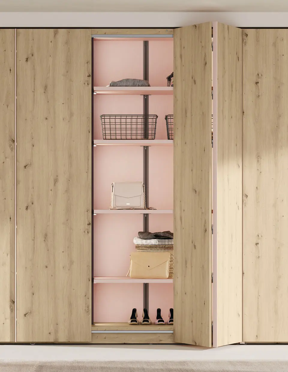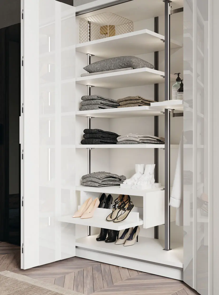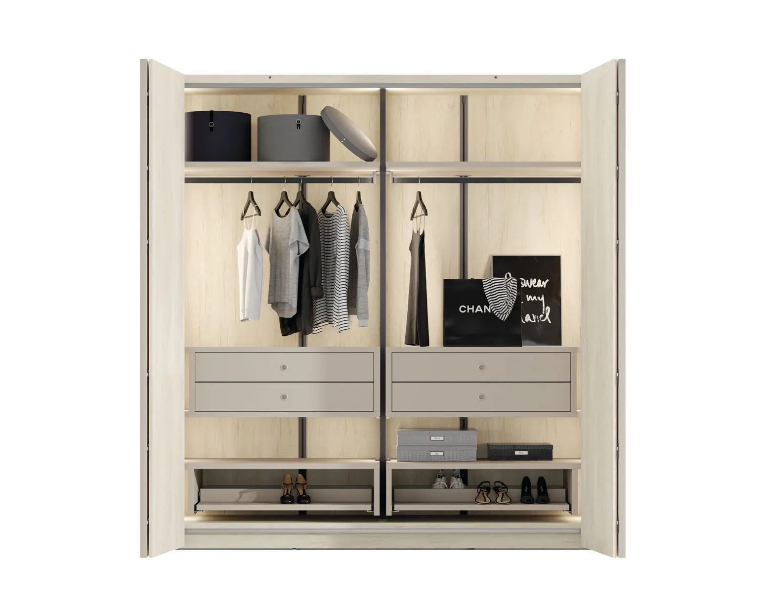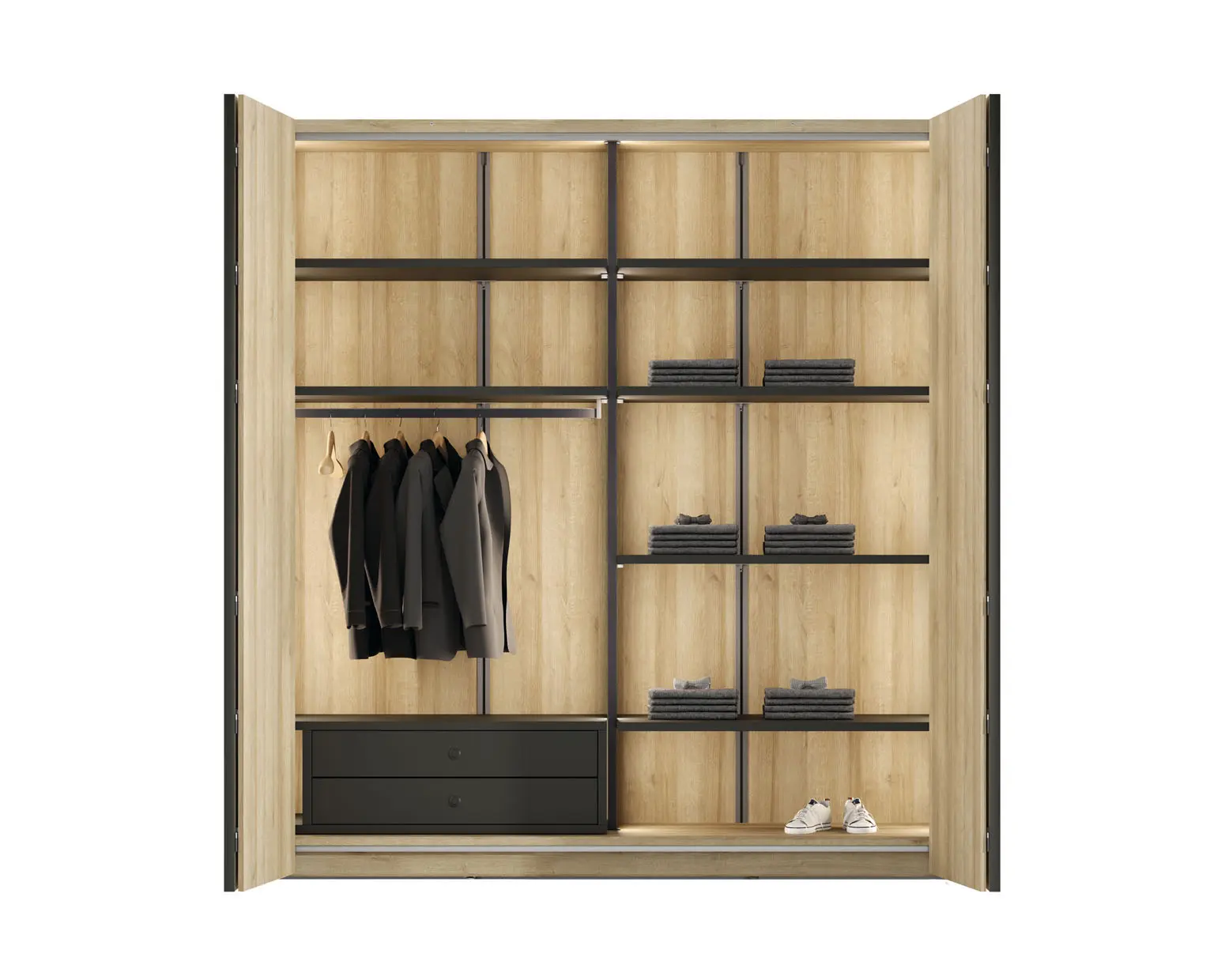 Al abrir las dos puertas hacia los lados te permite ver todo el interior del armario a la vez. Los armarios de puertas plegables incluyen un pilar central para poder instalar los estantes y accesorios. Todos los armarios de esta colección incluyen raíles de aluminio que permiten la libre distribución de los estantes y accesorios interiores y a la vez pueden incorporar iluminación led sobre el mismo raíl.