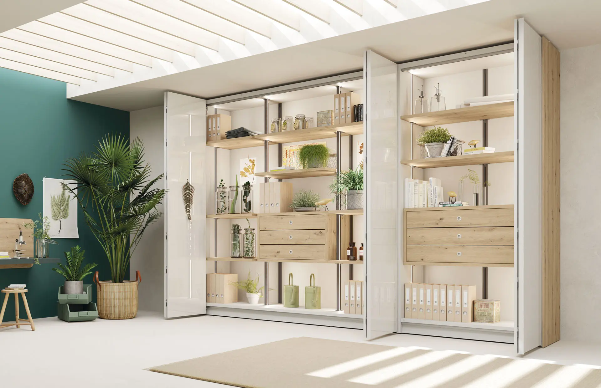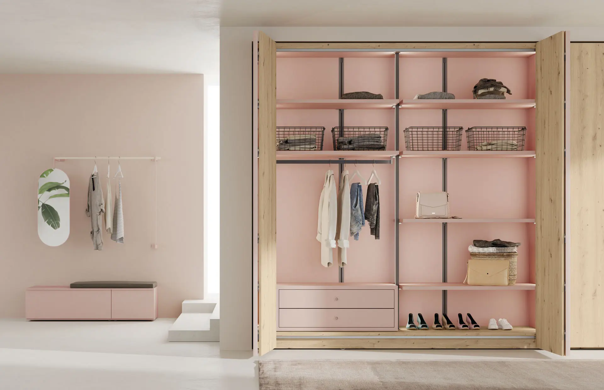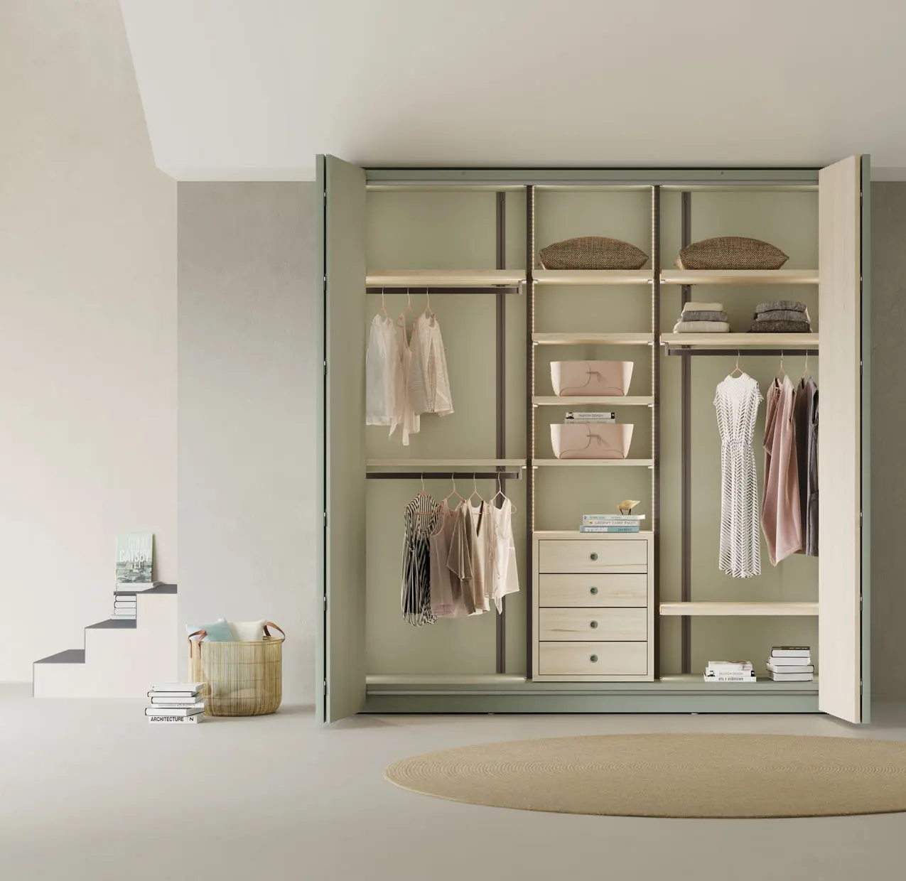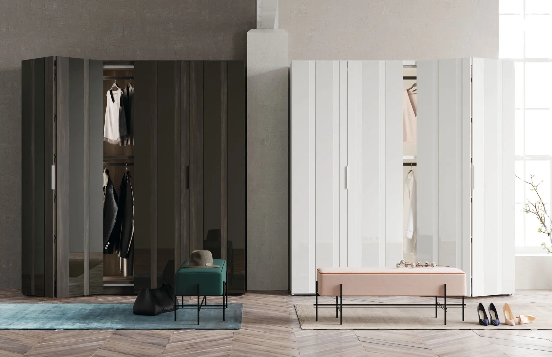 Al abrir las dos puertas hacia los lados te permite ver todo el interior del armario a la vez. Los armarios de puertas plegables incluyen un pilar central para poder instalar los estantes y accesorios. Todos los armarios de esta colección incluyen raíles de aluminio que permiten la libre distribución de los estantes y accesorios interiores y a la vez pueden incorporar iluminación led sobre el mismo raíl.