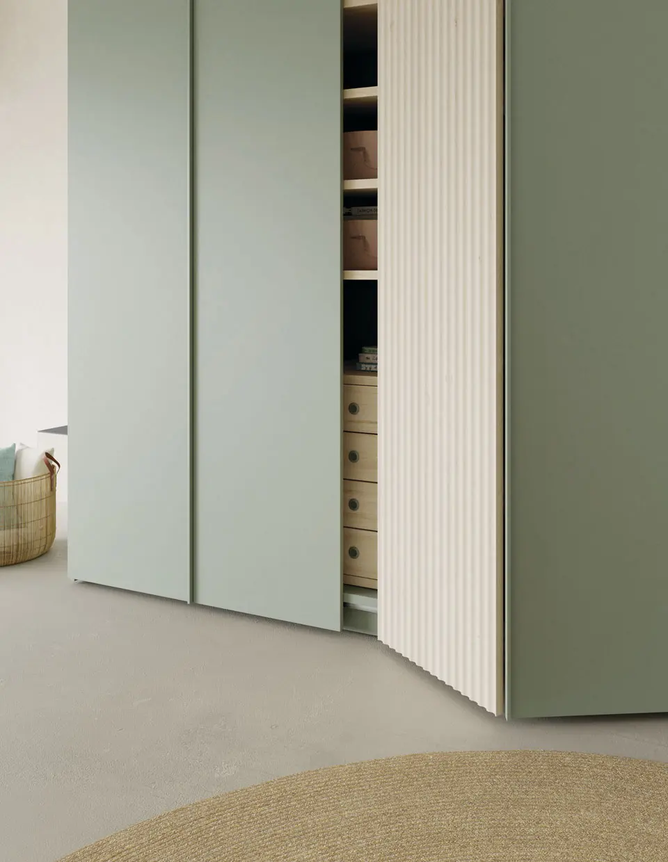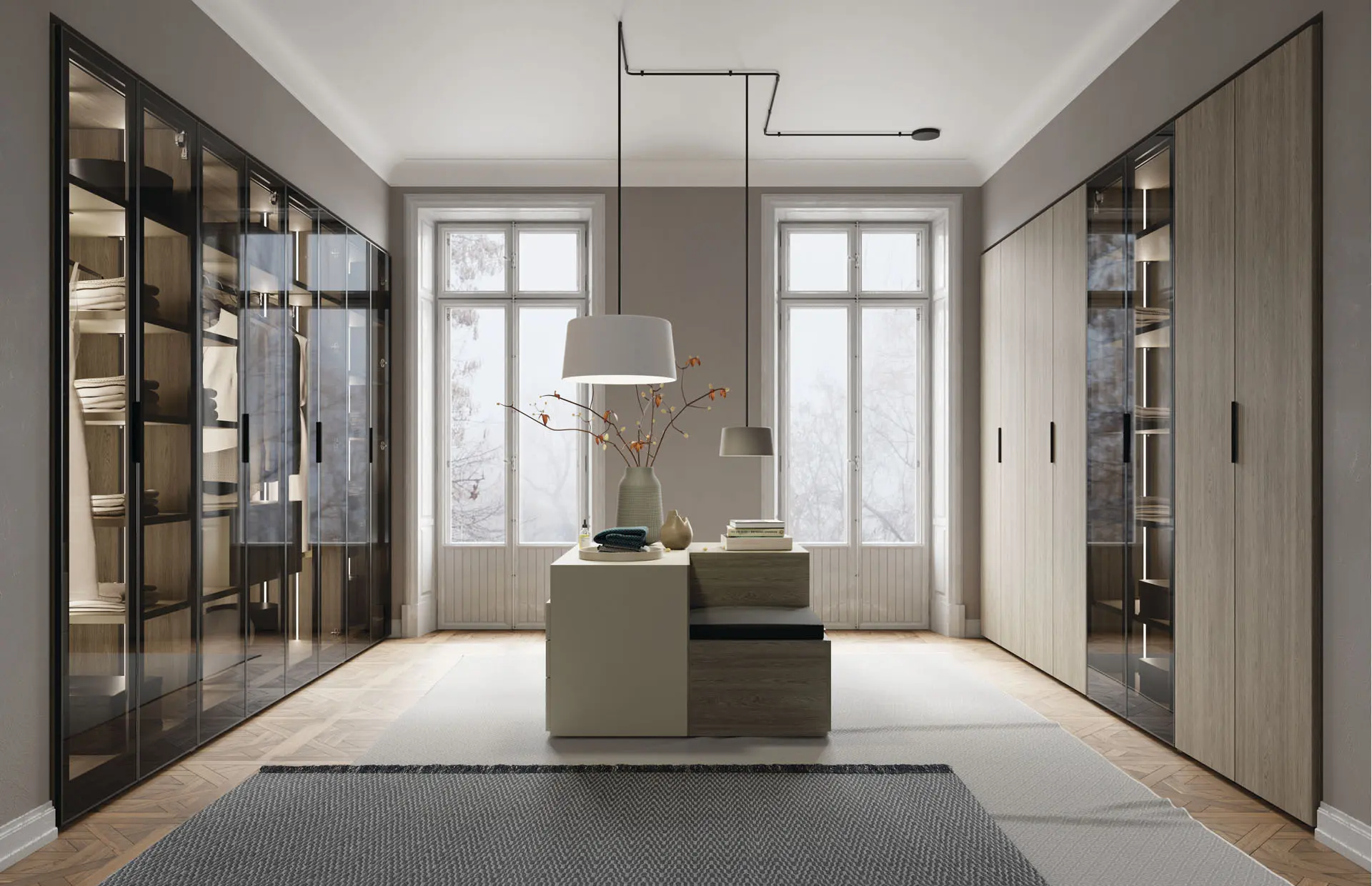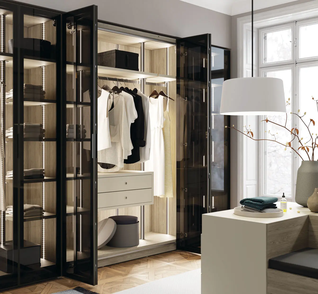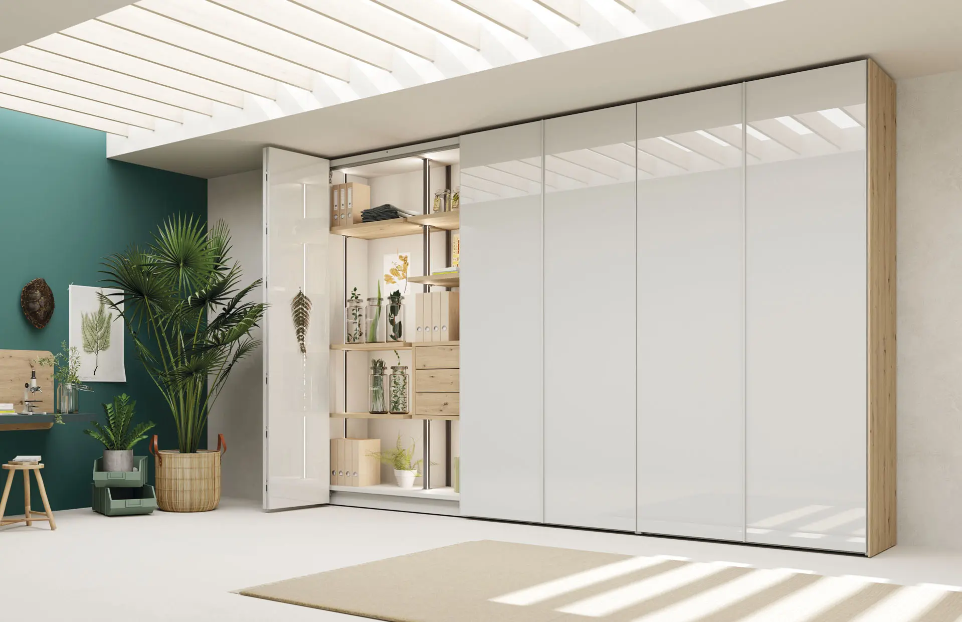 Al abrir las dos puertas hacia los lados te permite ver todo el interior del armario a la vez. Los armarios de puertas plegables incluyen un pilar central para poder instalar los estantes y accesorios. Todos los armarios de esta colección incluyen raíles de aluminio que permiten la libre distribución de los estantes y accesorios interiores y a la vez pueden incorporar iluminación led sobre el mismo raíl.