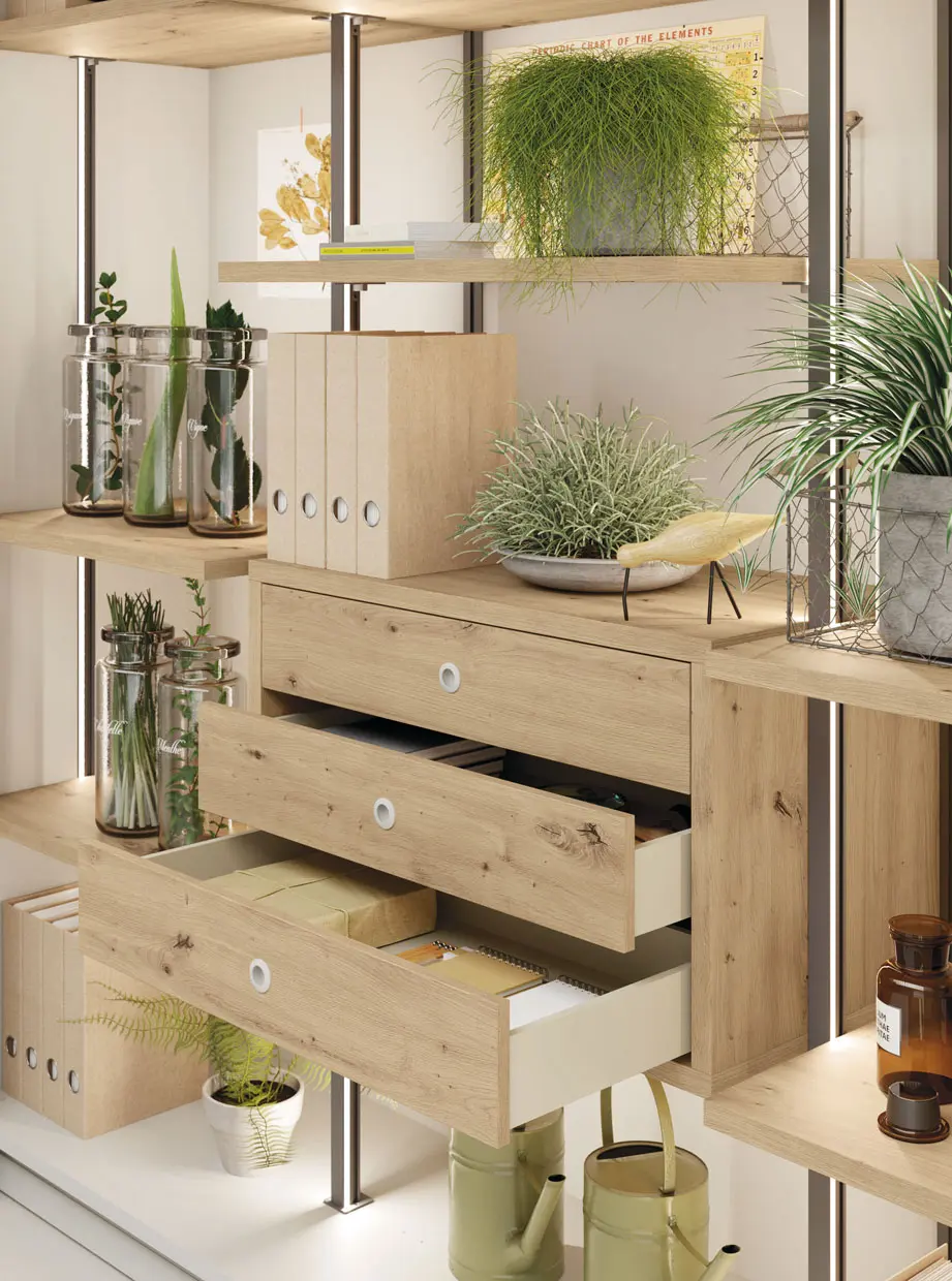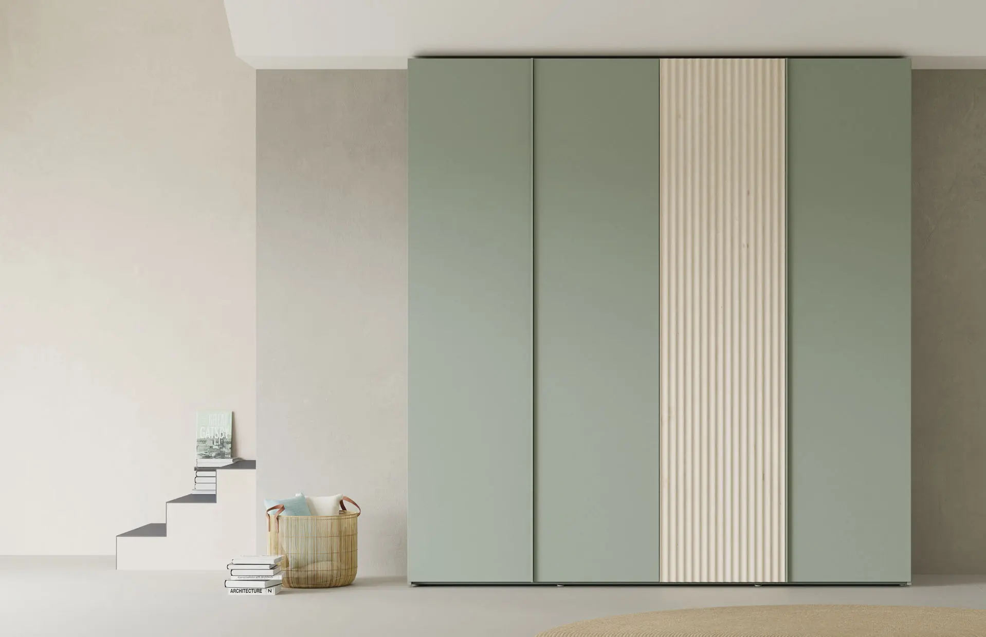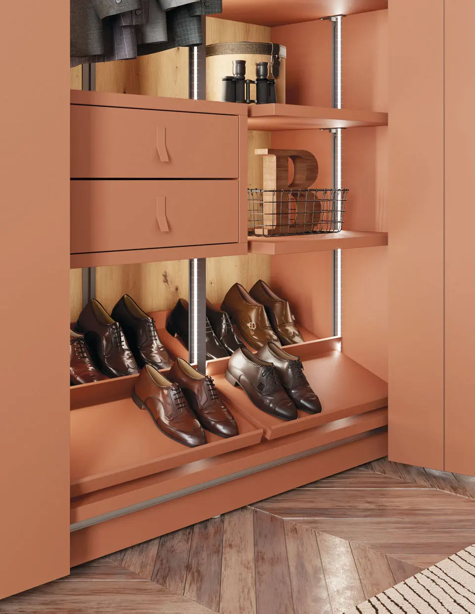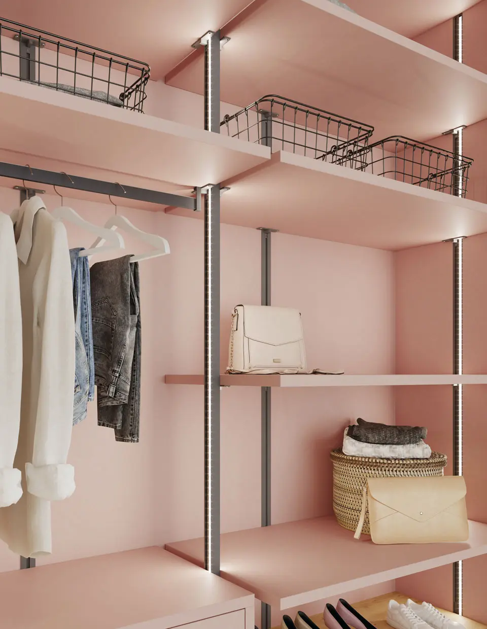 Al abrir las dos puertas hacia los lados te permite ver todo el interior del armario a la vez. Los armarios de puertas plegables incluyen un pilar central para poder instalar los estantes y accesorios. Todos los armarios de esta colección incluyen raíles de aluminio que permiten la libre distribución de los estantes y accesorios interiores y a la vez pueden incorporar iluminación led sobre el mismo raíl.