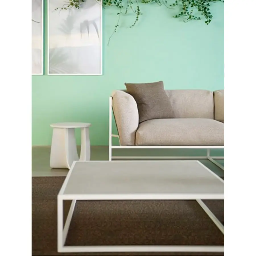 Estructura de soporte de carga en acero inoxidable, sección de 2 x 2 cm, recubierta de polvo epoxi con tratamiento específico para uso en exteriores. Sobre de laminado fino de gres porcelánico, variaciones mate en gris claro o negro. Bush martilló pietra di Savoia gris medio y corten satinado natural.