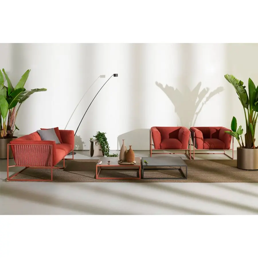 Pensada para su uso al aire libre, cuenta con una estructura de soporte de carga en acero inoxidable, sección de 2 x 2 cm, recubierta de polvo epoxi con tratamiento específico para uso en exteriores. Sobre de laminado fino de gres porcelánico, variaciones mate en gris claro o negro. Bush martilló pietra di Savoia gris medio y corten satinado natural.
