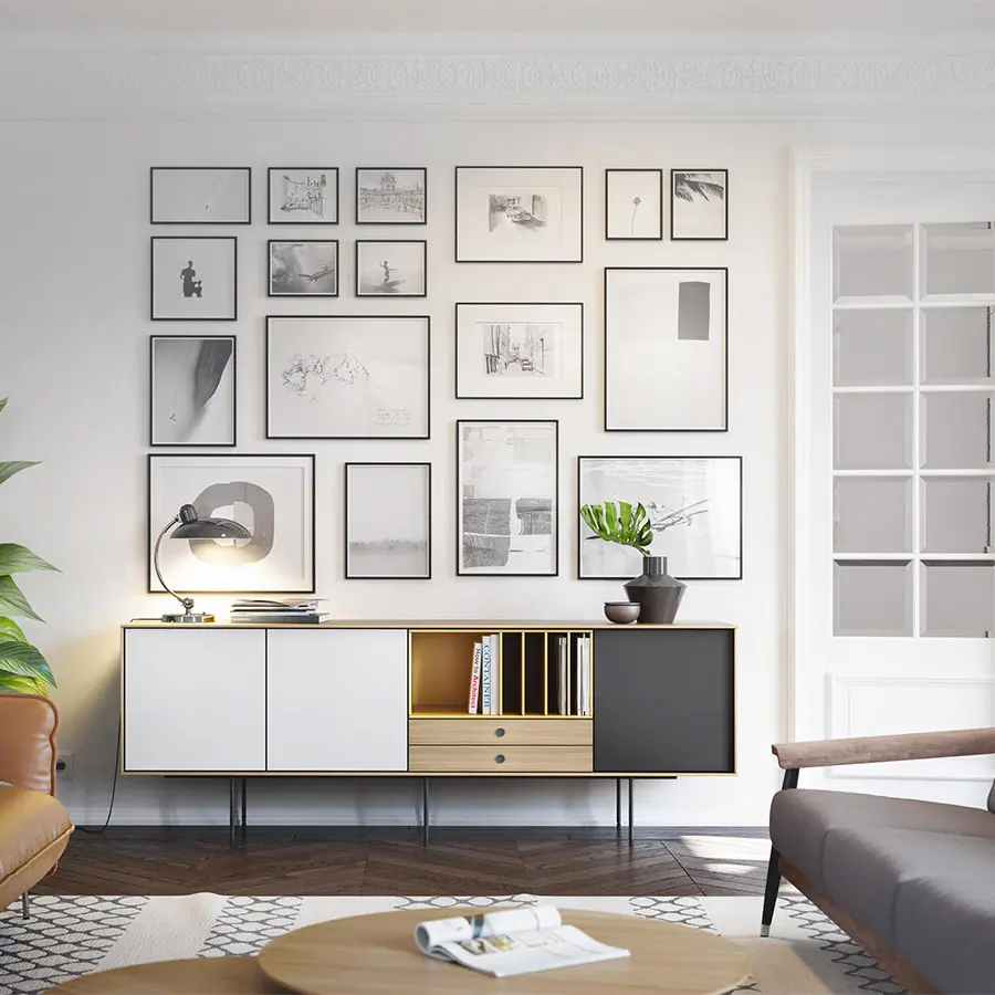 La colección Aura ha sido concebida como un programa para configurar principalmente aparadores y muebles para las zonas de salón/comedor. Su diseño está inspirado en tiempos pasados y bajo la influencia de la cultura del diseño de los paises nórdicos, que han sabido unir tradición y naturalidad con grandes dosis de modernidad. El resultado: una colección llena de memoria que desprende un aura muy actual. Los pies metálicos y de madera diseñados especialmente para la colección refuerzan esa imagen retro/atemporal. Especial importancia tienen los acabados seleccionados: la madera de nogal y roble con una acabado hiper-natural y los lacados que combinan perfectamente entre sí con las maderas.