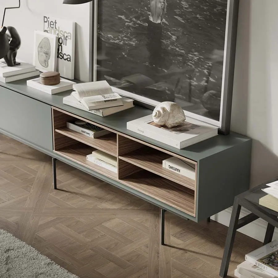 Mueble TV de la colección Aura de Treku, diseñada por Angel Martí & Enrique Delamo. Compuesta por un módulo con dos cajones con tiradores, otro módulo abierto con dos cajones y un último módulo compuesto por dos puertas con tiradores.