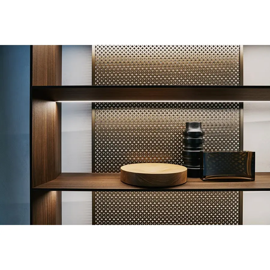 El diseño de único perfil en V se utiliza tanto para la estructura como para los estantes de la librería. Como siempre el uso de materiales tecnológicos caracteriza este proyecto. Estantes estructurales compuestos por paneles en multicapas, reforzados con aluminio y modelados en folding. El añadido de un perfil en material compuesto estructural, realizado mediante un proceso de extrusión por tracción, permite lograr la máxima resistencia a las cargas. AVA incorpora a los estantes luces led. El acabado externo es en madera de eucalipto. La trasera está realizada utilizando una chapa de aluminio especial que se caracteriza por una textura tridimensional conseguida mediante corte láser.