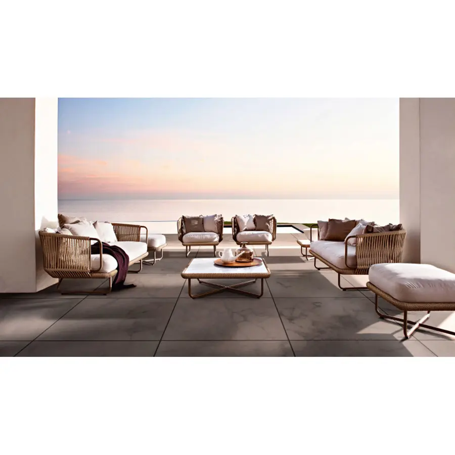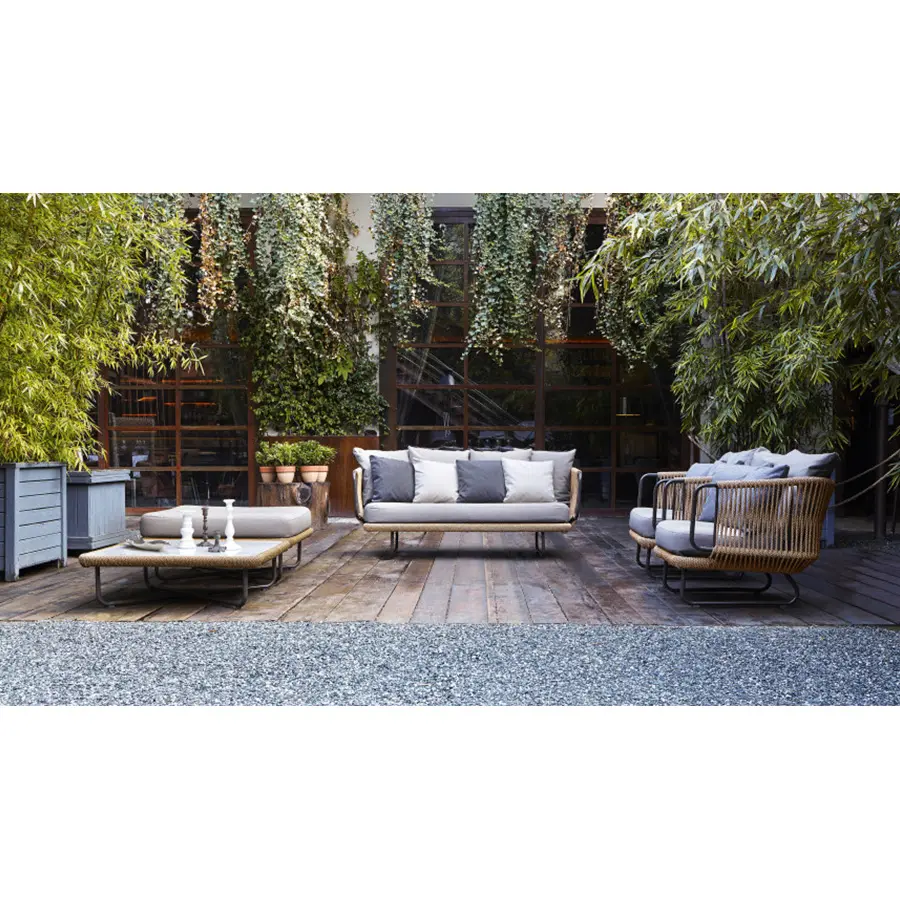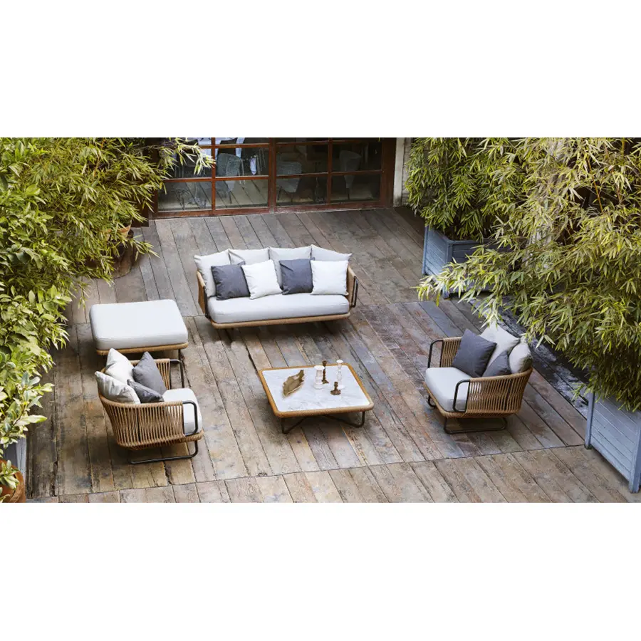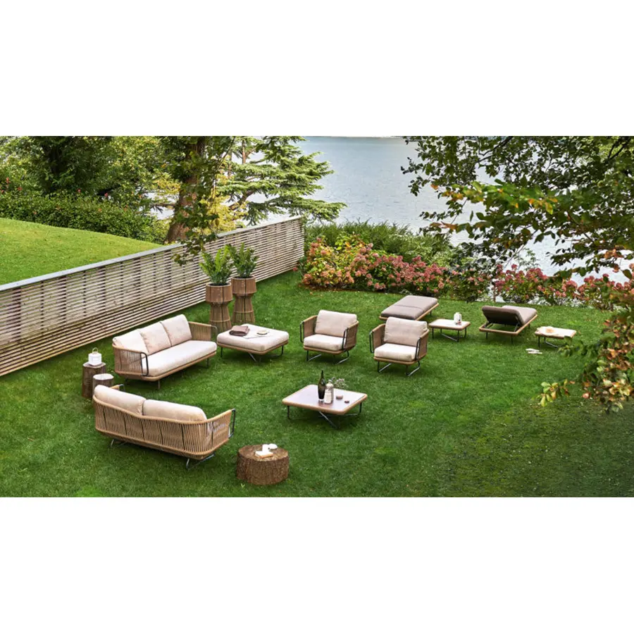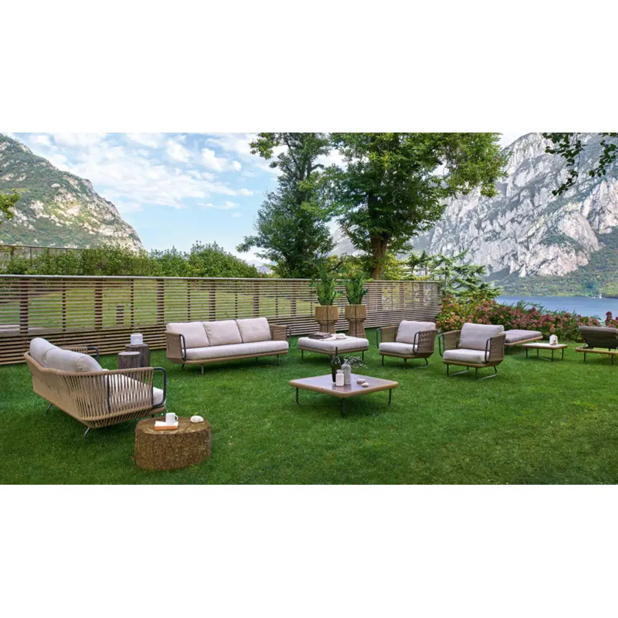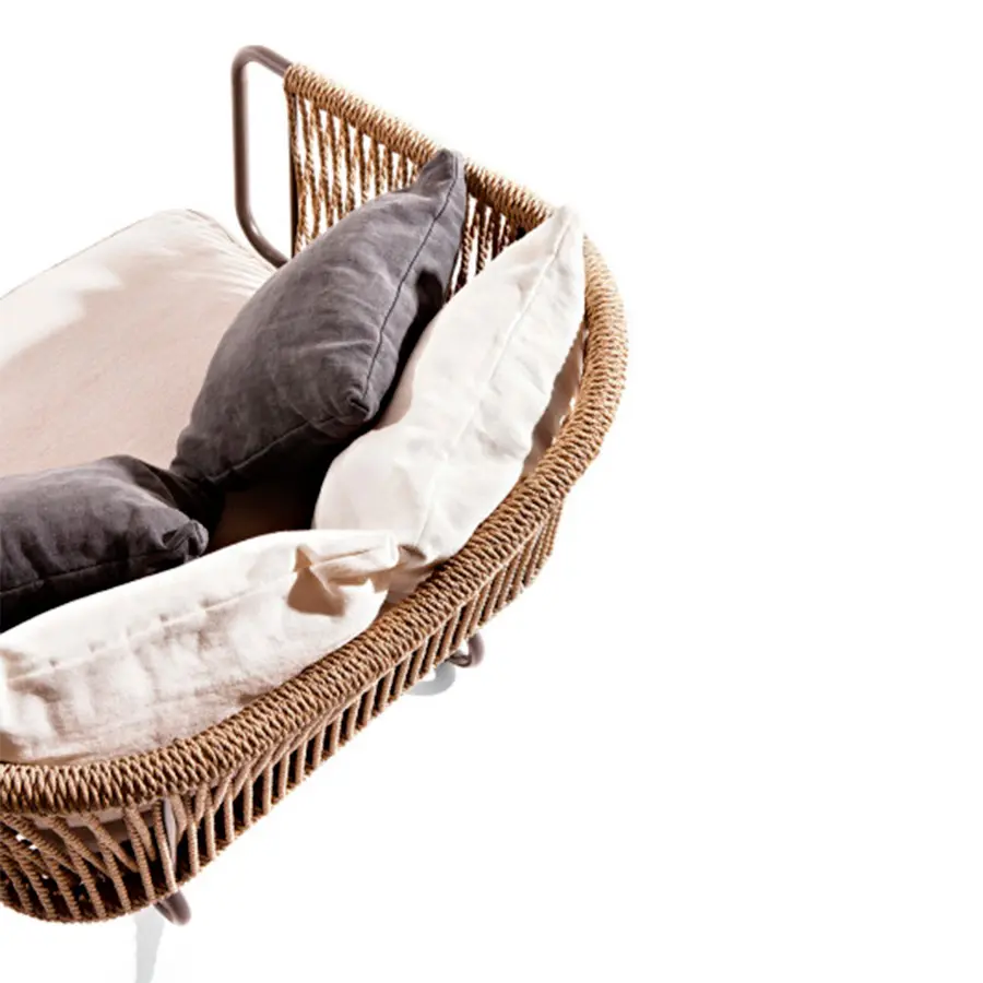 Esta colección incluye sillas y mesas de aluminio barnizado decoradas con cuerda de fibra sintética. Es un sillón con diseño tejido a mano ideal para decorar con estilo una terraza, una habitación o sala de estar.