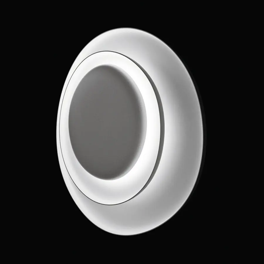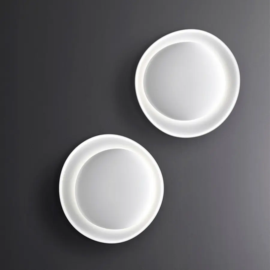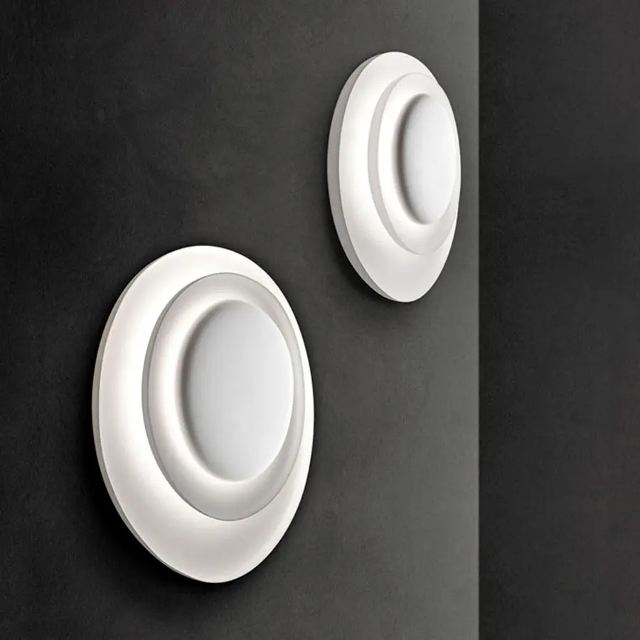 Lámpara de pared y de techo de luz reflejada y difusa. Formada por dos platos ovalados en policarbonato mate blanco estampados por inyección y montados asimétricamente. El plato más grande hace las veces de sujeción de pared, el plato central esconde la parte luminotécnica.