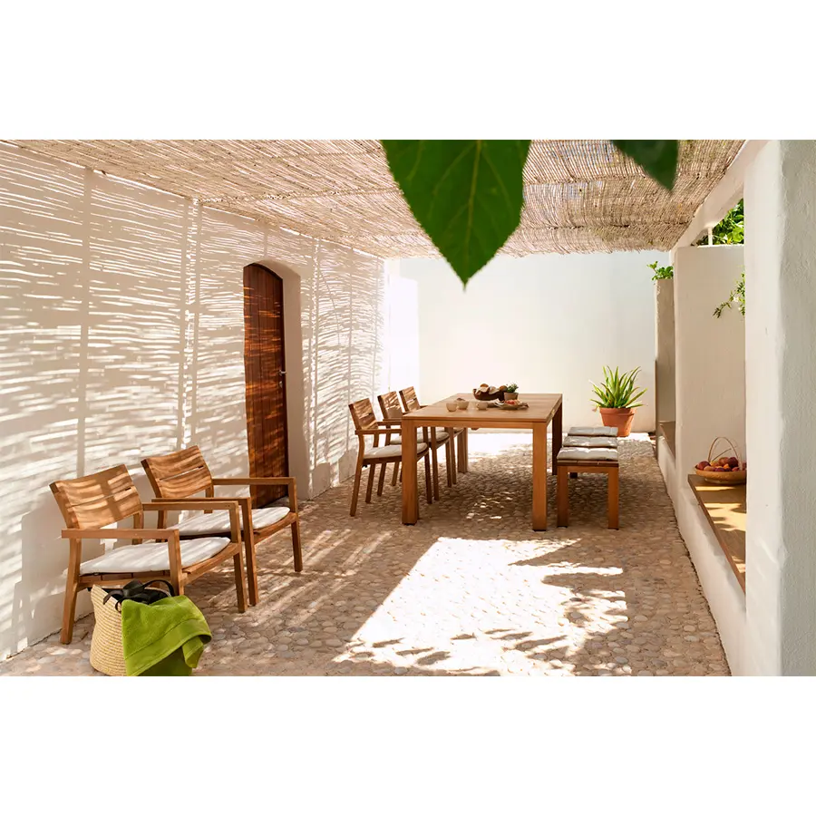 Chic básico con un confort de uso óptimo. La combinación de los anchos listones y el diseño puro a la par que rudo, dejan ver el lado más robusto y moderno de la teca. La teca que Tribù elige para sus muebles de exterior es teca de la mejor calidad. Solo se tiene en cuenta madera de primera clase con grano recto. Esta madera se cultiva durante todo el año en plantaciones indonesias gestionadas de manera sostenible. Los cultivos son controlados localmente por la filial Tribù Asia. Este banco es una alternativa informal a las sillas de mesa, pero también es perfecto como banco independiente en el jardín.