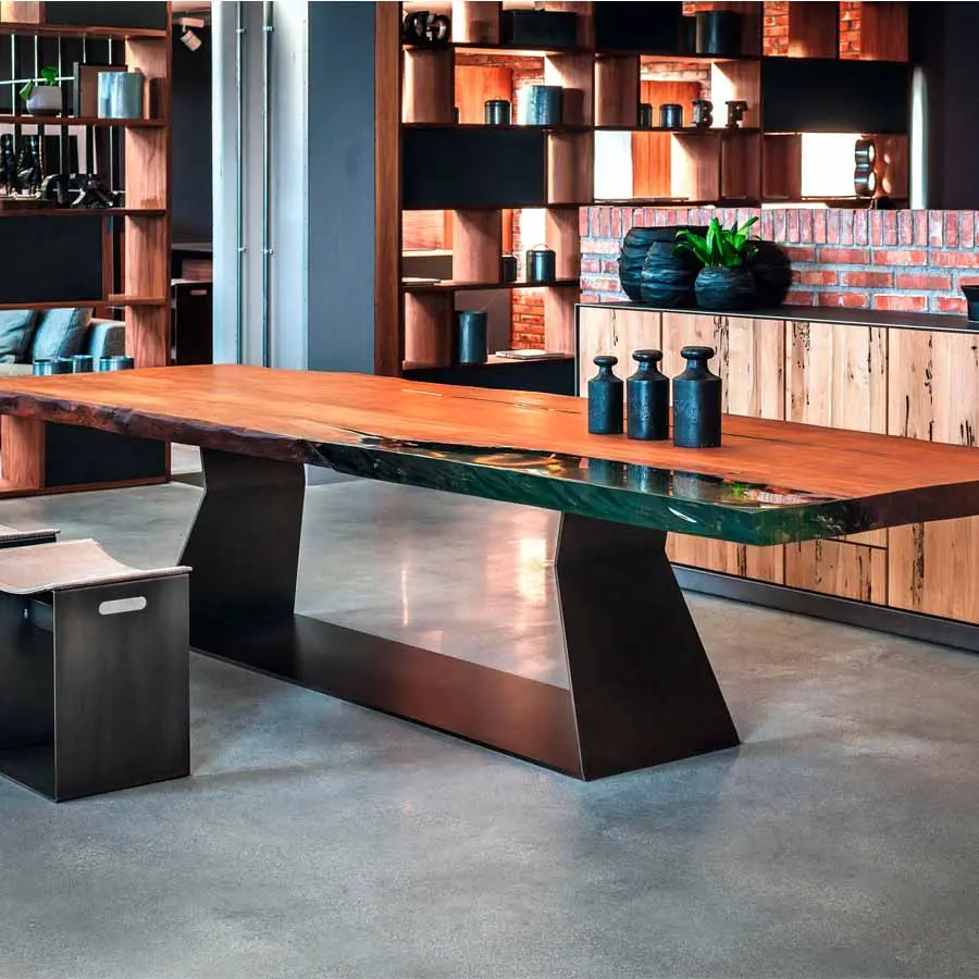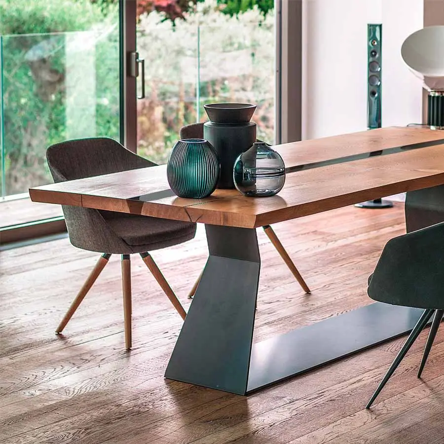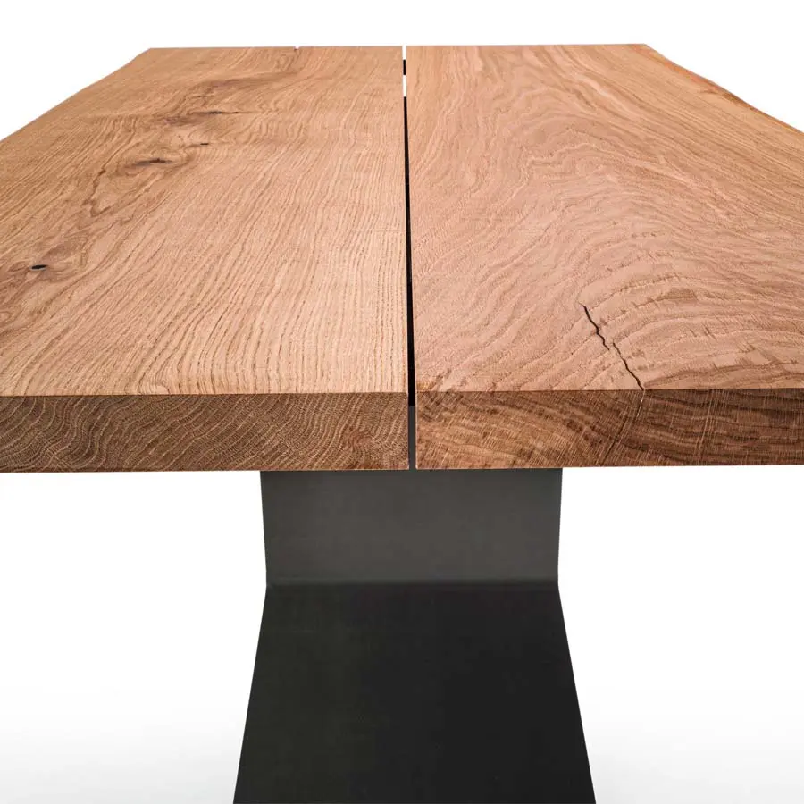 Mesa con sobre de madera maciza, compuesta por dos tablones simples alineados, con intersticio y laterales naturales. Bajo pedido, disponible con lamas asimétricas desplazadas de 30 cm (Bedrock Plank B). Base en chapa de hierro caracterizada por líneas geométricas.