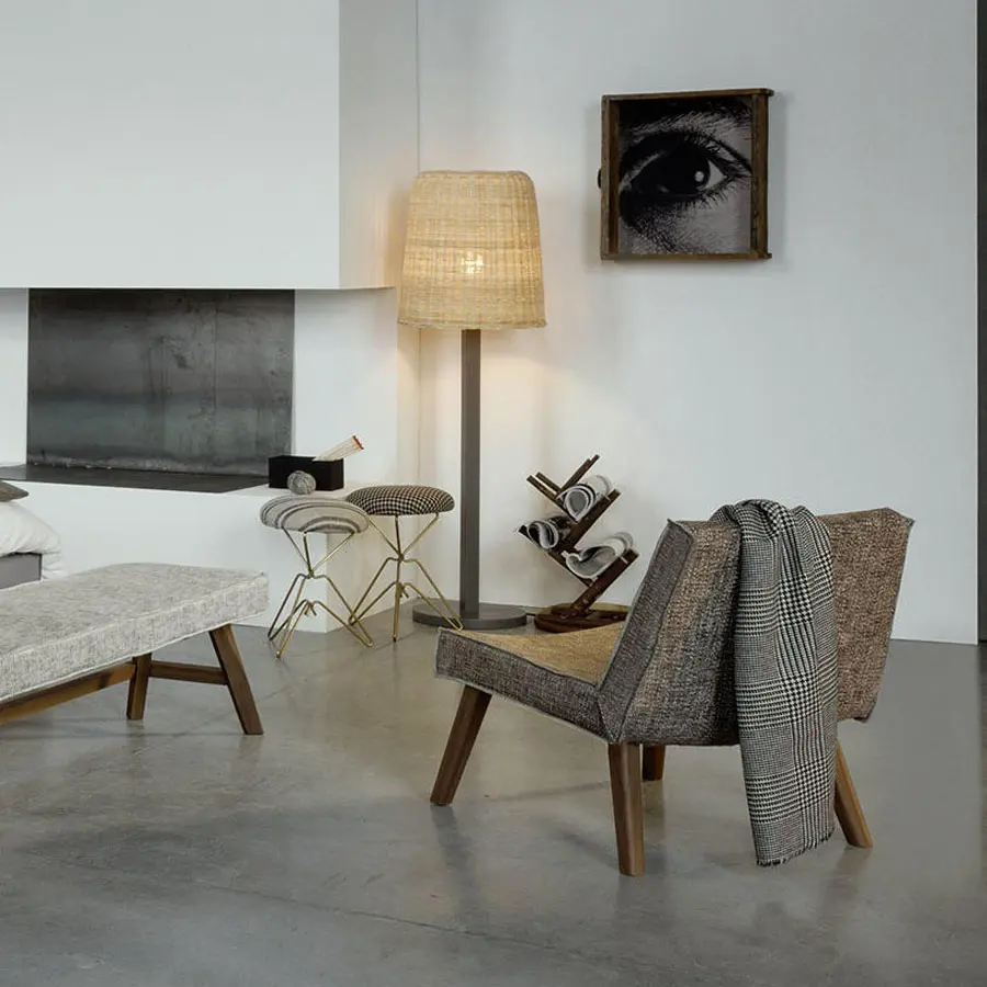 Diferentes materiales enfrentados para el sillón LC 24. Accesorio de decoración para completar la zona de dormitorio, tiene una forma compacta y, al mismo tiempo, acogedora. Se caracteriza por patas de nogal Canaletto natural, negro, blanco, gris, océano o tórtola, y una funda extraíble de tejido o cuero de imitación con costura francesa.