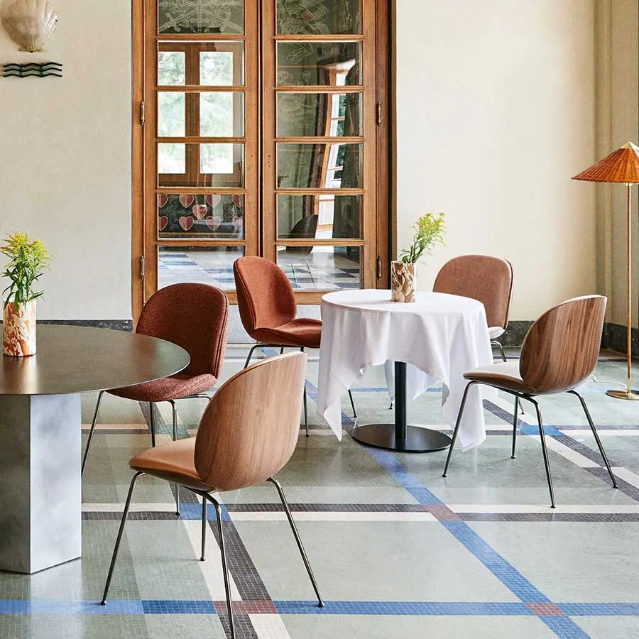 El dúo de diseñadores visionarios GamFratesi ha mejorado aún más el icónico diseño de la silla Beetle. El diseño original se inspiró en el caparazón iridiscente del humilde escarabajo, el caparazón curvo imitando la forma natural del insecto. La carcasa de chapa está disponible en una selección de maderas, lo que añade un toque de prestigio al diseño. El cuero o la tapicería se combinan con la madera para agregar un rico tacto a la pieza, lo que la convierte en el complemento perfecto para cualquier comedor.
