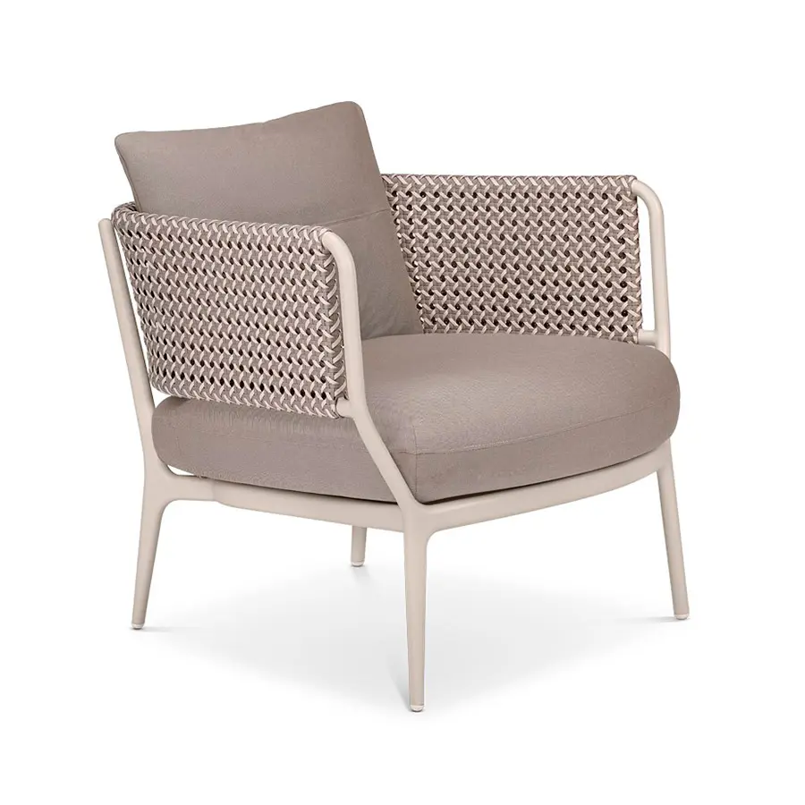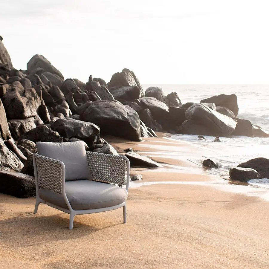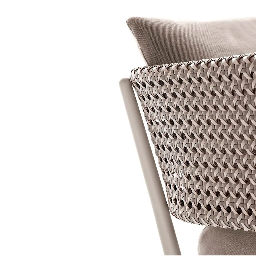 El sillón BELLMONDE combina un diseño moderno con elementos tejidos de la lujosa fibra DEDON. Un lenguaje armónico de formas, junto con un tejido de fibra multicolor tipo mélange, le da a la silla comodidad y espíritu.