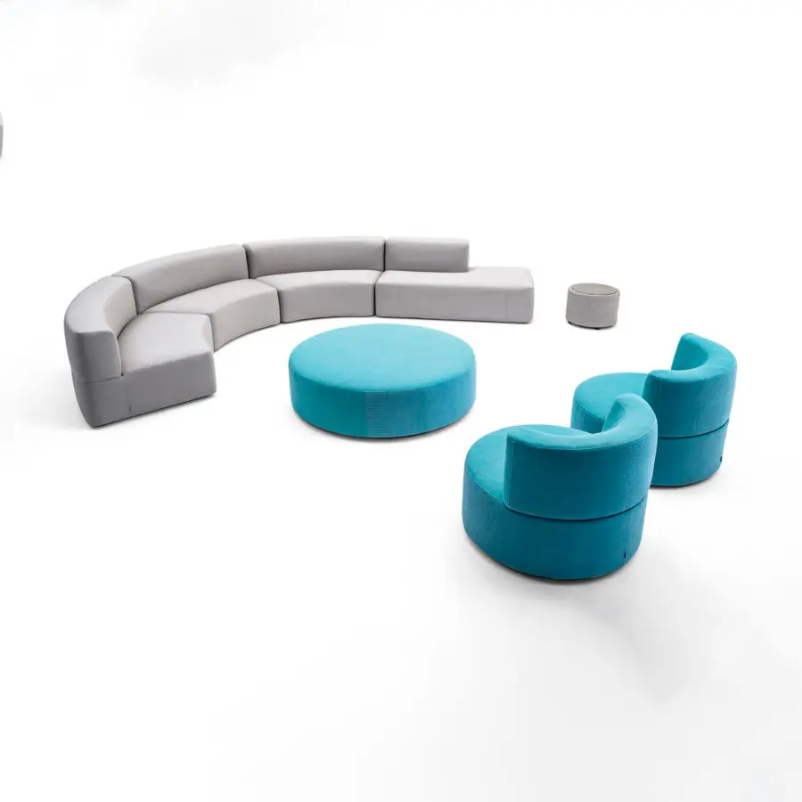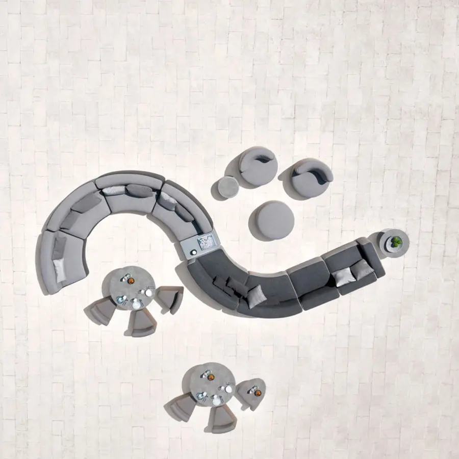 El sillón de cinturón tiene una forma redondeada disponible en dos medidas, ø 135 cm o 90 cm y está disponible en versión mono o bi-tela. Es ideal para uso en exteriores y resistente a la intemperie.