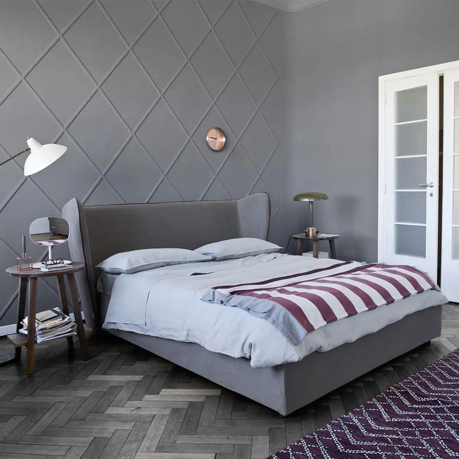 Cama caracterizada por un amplio cabecero envolvente que parece abrazar la estructura de la cama, Bergere es una cama revestida con estructura desmontable y funda extraíble de tejido o cuero de imitación. Patas de madera maciza, disponibles en: nogal natural, negro, blanco, gris, océano o tórtola.