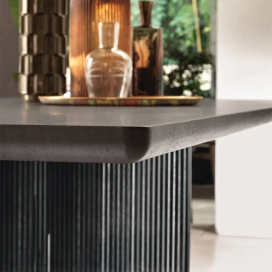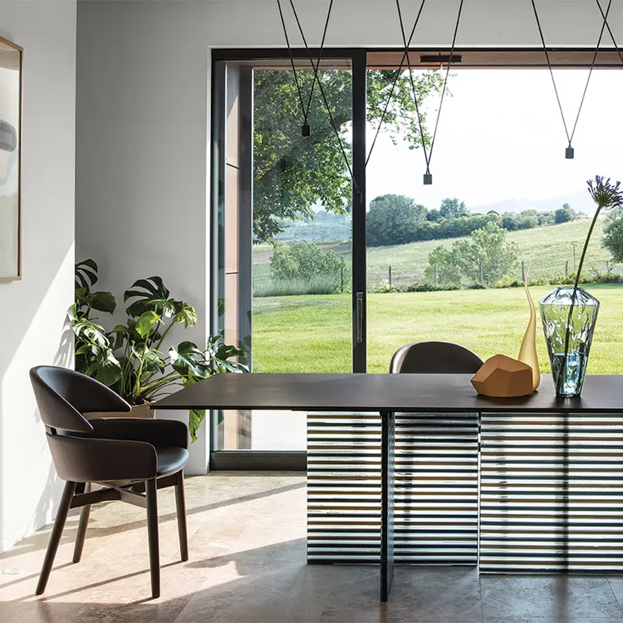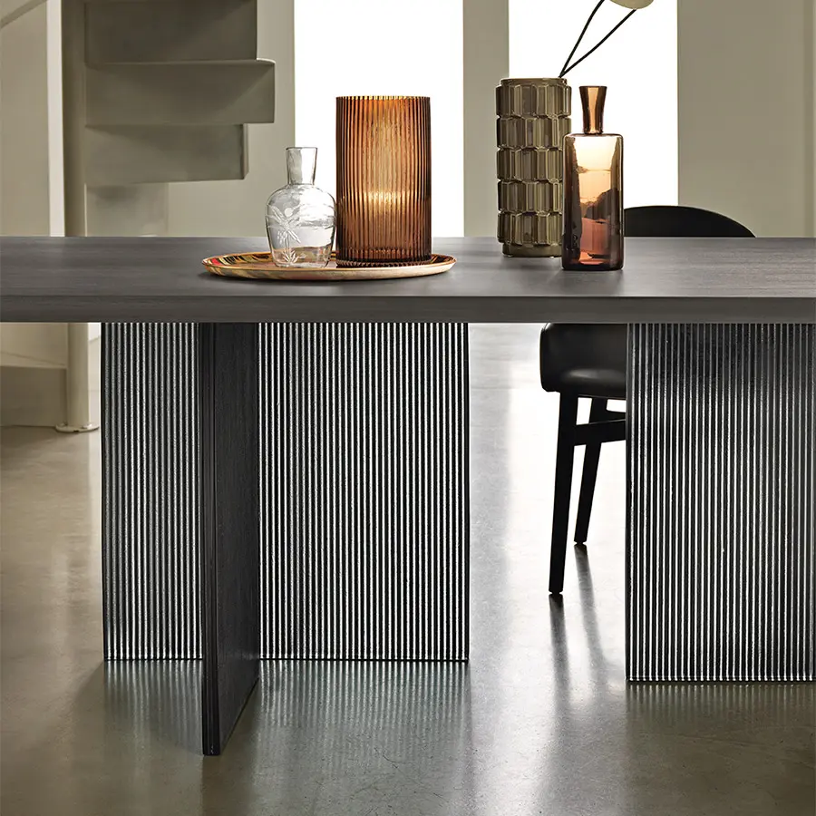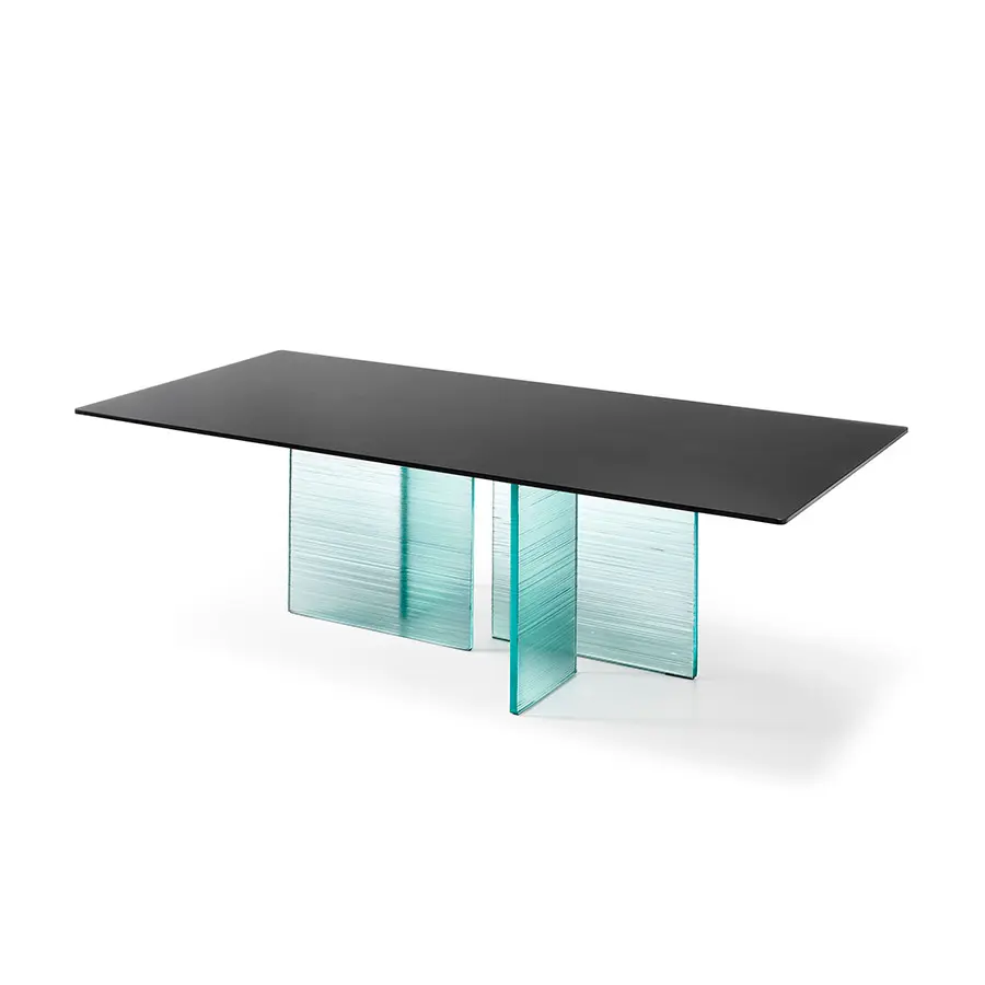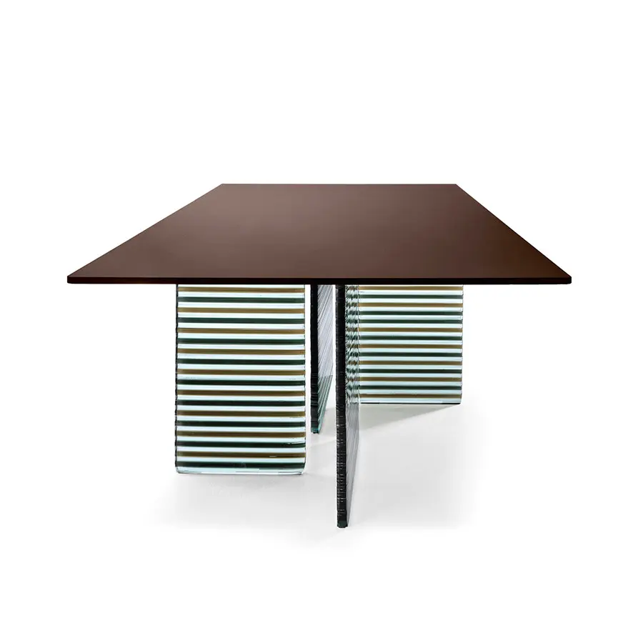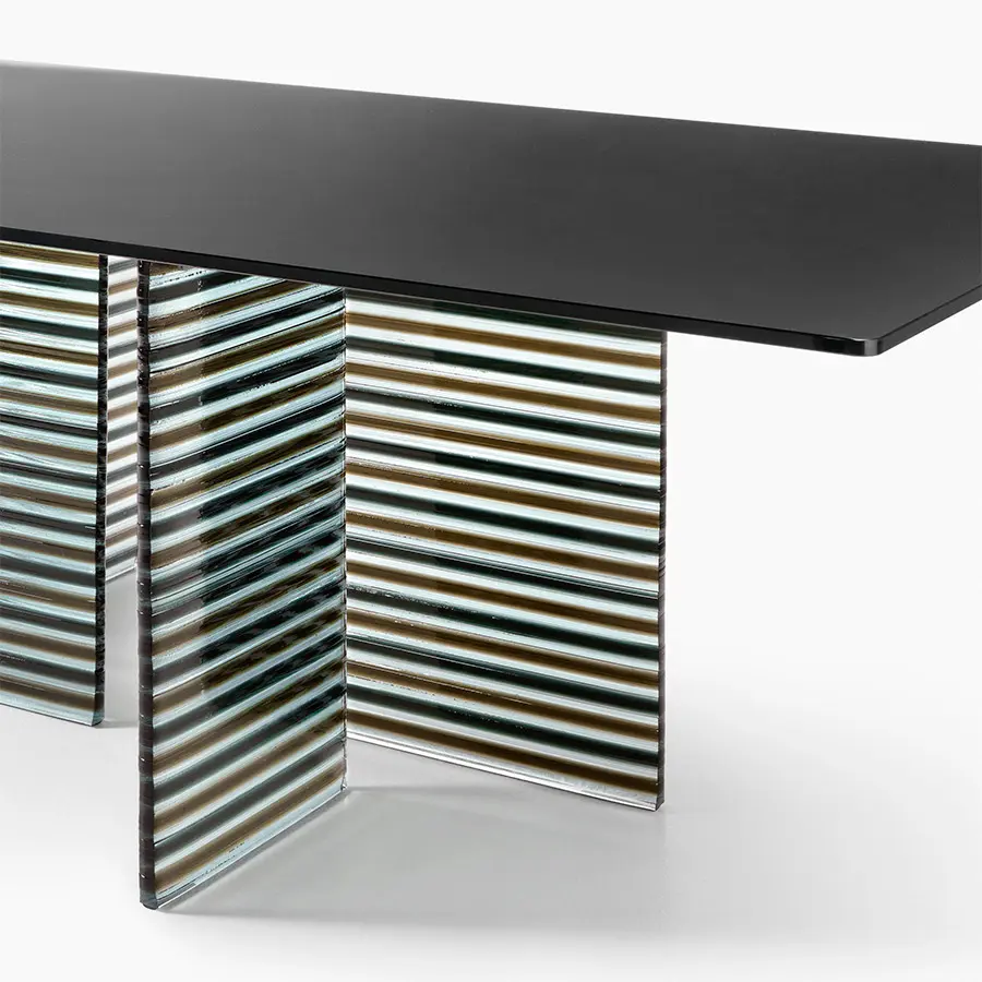 Mesa con base compuesta por cuatro elementos en vidrio DV de 30 mm transparentes o con rayas coloreadas. Tapa en vidrio de 12 mm o de 15 mm transparente retrobarnizado con tintas monocromàticas, o bien cubierto de Ecomalta espatulatura a mano de grano fino.