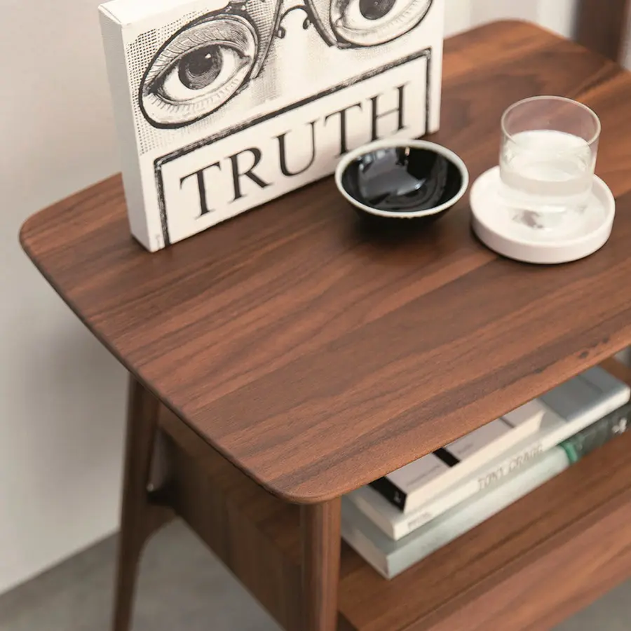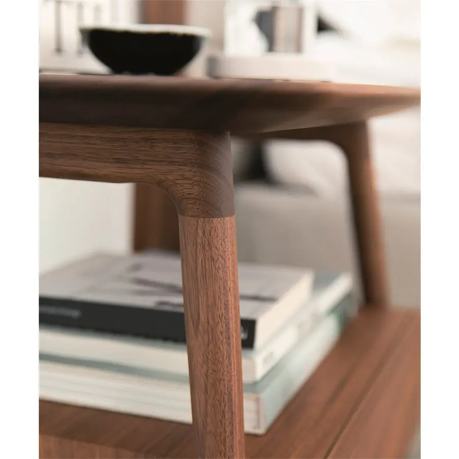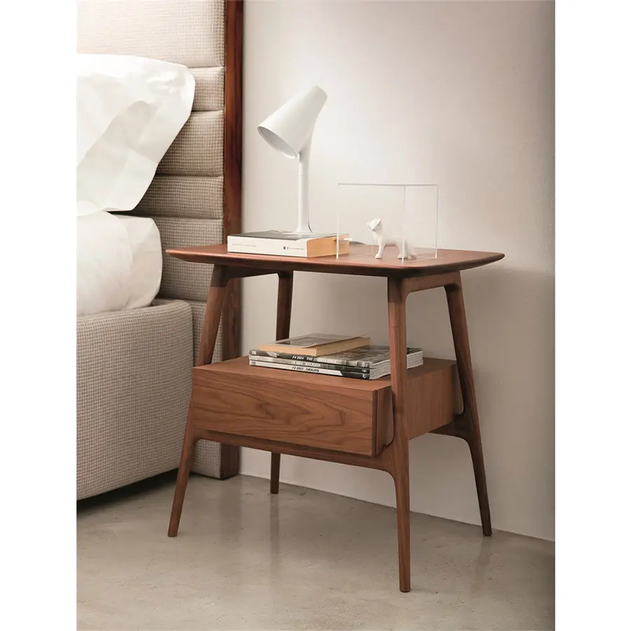 Mesa de noche con estructura en nogal canaletta macizo y cajón.