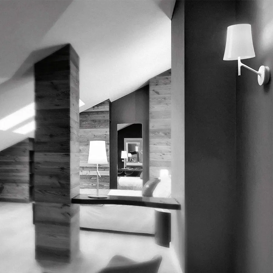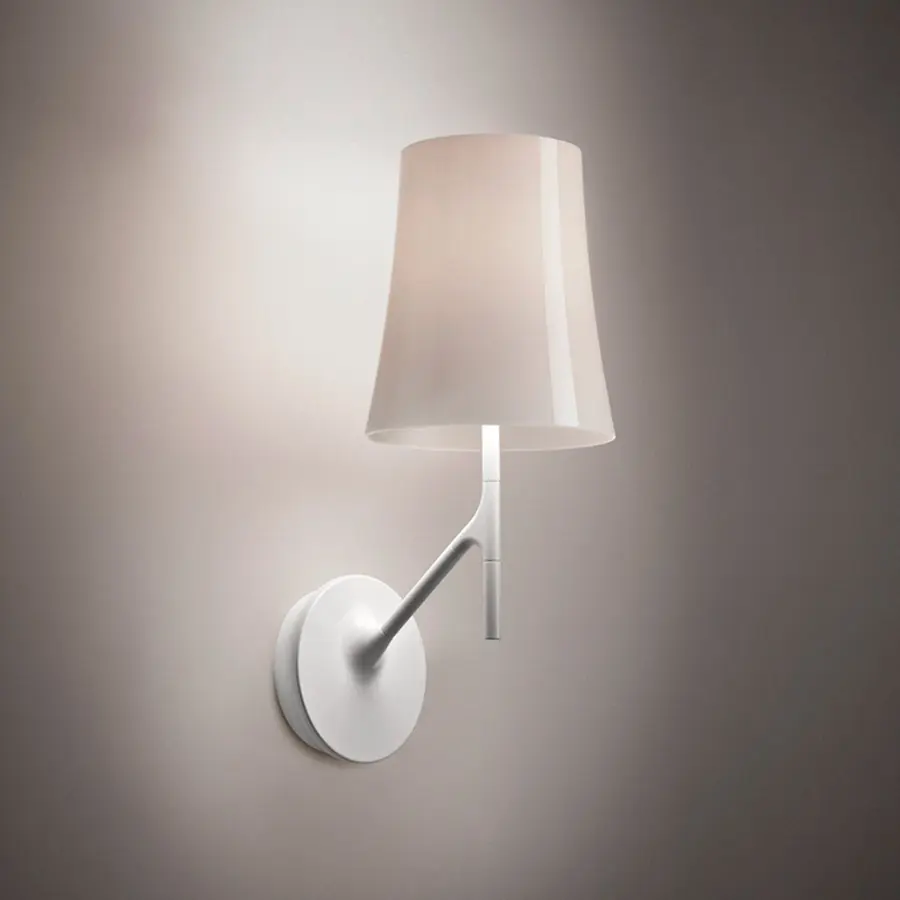 Una lámpara fina y estilizada, como el tronco de un árbol. Una pantalla que recuerda la clásica forma de la lámpara de lectura. Un sistema de encendido diseñado como un ramo, listo para acoger un pajarillo, un «birdie» en inglés. Tres elementos que se relacionan entre ellos con espontaneidad, para dar vida a una lámpara amistosa que conjuga un toque ligero, continuo y familiar, y un carácter decidido. Realizada con materiales resistentes y ligeros, dinámica en las infinitas posibilidades de colocación sobre su base circular, Birdie asume diversas personalidades según el color que se escoge: discreta y casi invisible en la versión blanca, protagonista y capaz de caracterizar todo un ambiente en las versiones amaranto, anaranjada o gris. El modelo de pared completa la familia de las lámparas Birdie, aumentando la posibilidad de crear combinaciones entre versiones distintas, coordinando la iluminación de toda una habitación.