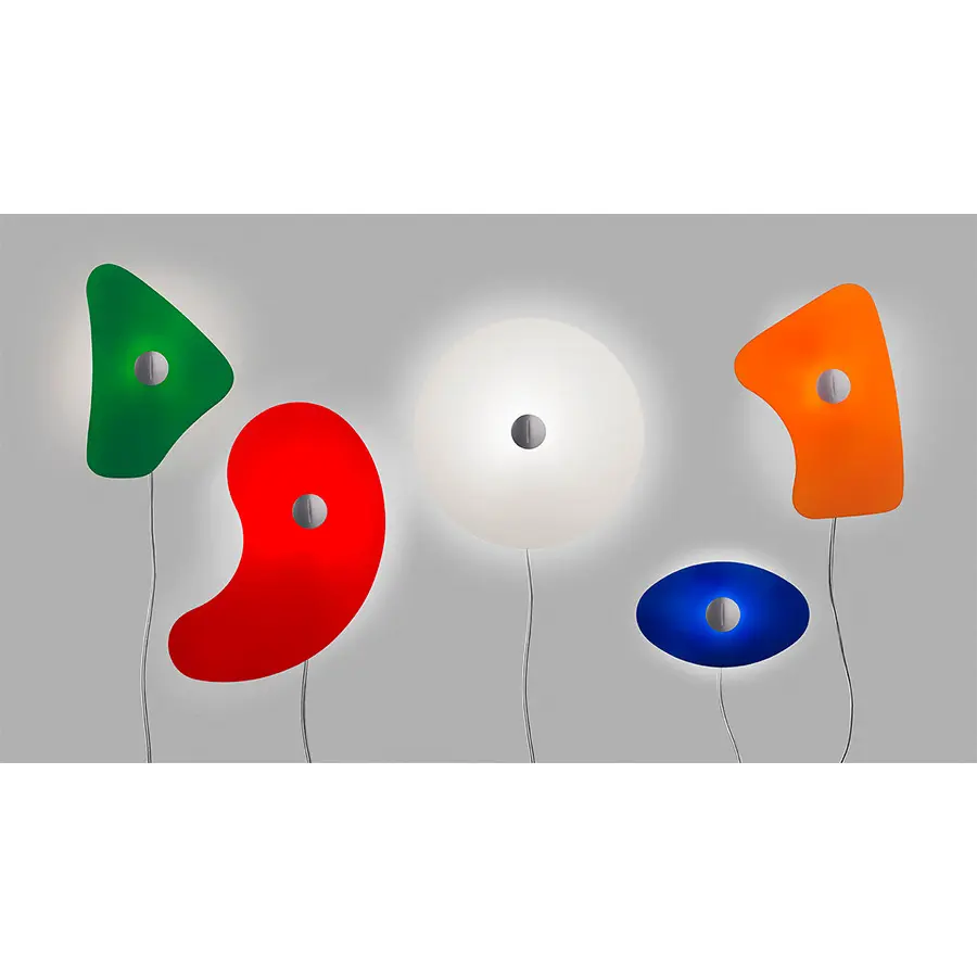 La primera lámpara diseñada por Ferruccio Laviani pensando en una escultura se declina en una lámpara de pared: los cinco difusores de Orbital se convierten en las cinco diversas versiones de Bit, un aplique modular. Cada placa en vidrio industrial serigrafiado tiene una forma irregular, para obtener un efecto de gran impacto gráfico, tanto para usarla de forma individual como en composiciones multiformes. La versión blanca es muy eficaz utilizada tono sobre tono para valorizar el perfil de las formas que parecen recortarse en la pared. Los difusores de colores, en cambio, evocan un dibujo surrealista cuando las lámparas están apagadas y la luz juega con las vidrieras tipo mosaico cuando están encendidas. El cuidado por los detalles llega hasta el tratamiento superficial de los difusores, satinados por el exterior para dar pastosidad al color y evidenciar las formas, brillantes por el interior para reflejar la luz.