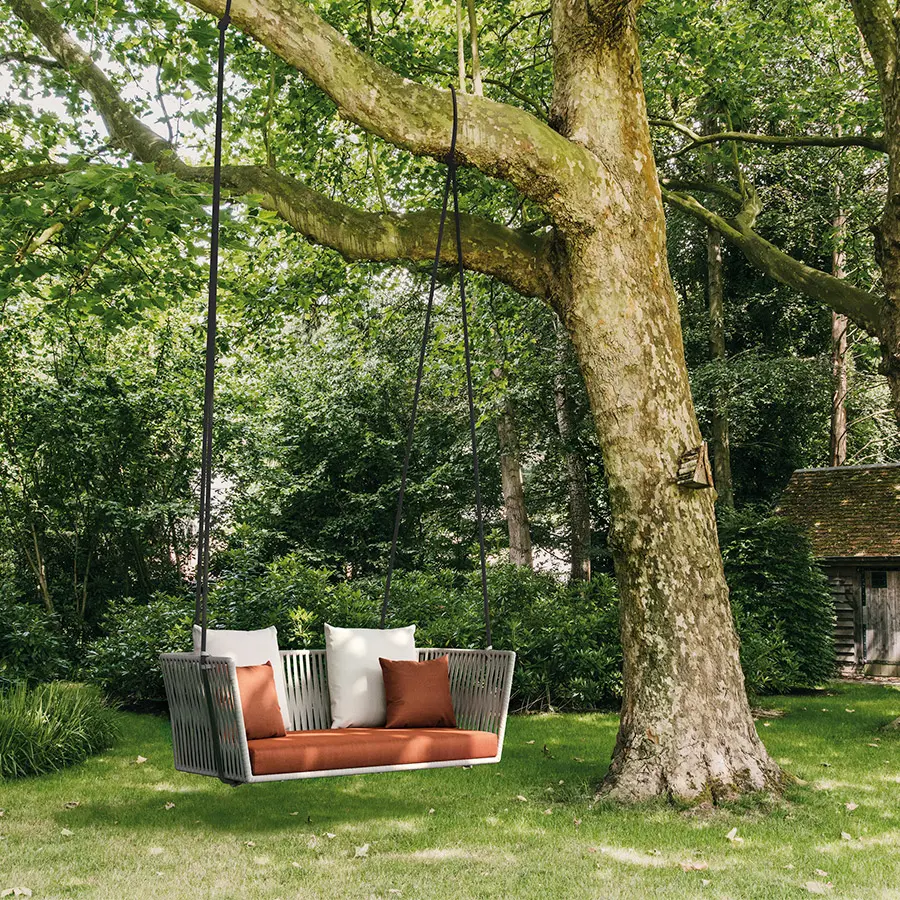 Sofá columpio de exterior de la colección Coma de Kettal. Bitta se caracteriza por una combinación de estructuras de aluminio, asientos trenzados con cuerda de poliéster y cómodos cojines, madera de teka y piedra para los sobres de mesa, materiales perfectamente resistentes a la intemperie. “La intención del diseñador era crear un trenzado denso pero que respirara que recordara el trenzado de los cabos que se utiliza para amarrar las barcas a los amarraderos (de ahí el nombre Bitta, que significa ‘amarradero’ en italiano)–, que confiriera a las piezas una sensación de ligereza pero, que éstas se vieran como nidos acogedores en tonos naturales en los que relajarse.”