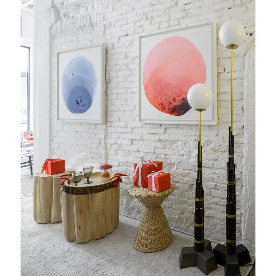 Familia de lámparas de pie, Black 92/93 se caracterizan por una estructura de latón bruto rodeada de cañas de bambú negro, que dan vida a una forma que remite a los rascacielos de una metrópolis. Disponibles en dos tamaños, tienen en ambos extremos, respectivamente, una base de fundición de hierro y un cuerpo iluminado de vidrio opalino.