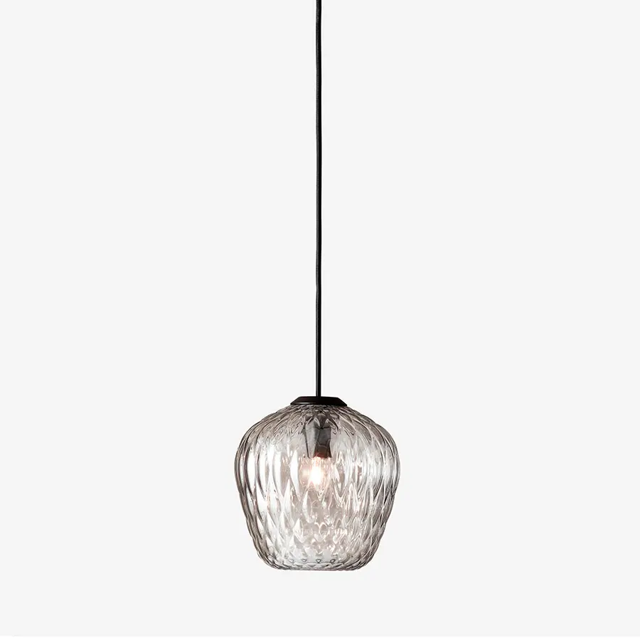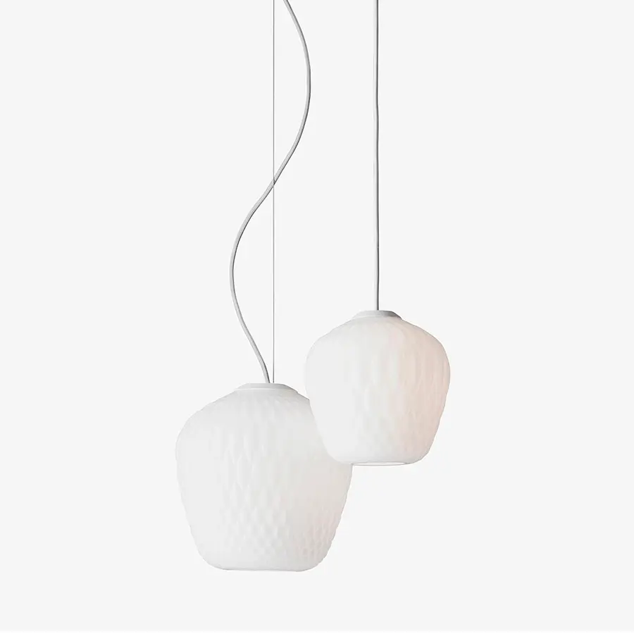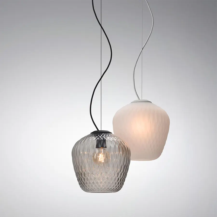 La textura de la superficie del vidrio hecho a mano crea hermosos reflejos cautivadores y estampados. Ya sea de forma individual o como en grupo. El diseño se inspira en los los frutos de frambuesas, cerámicas antiguas y botellas de espejos. Los dos acabados se adaptan a una gama de interiores, el acabado opal proporciona un brillo sutil, mientras que el translúcido se transforma con un patrón de lices y sombras.