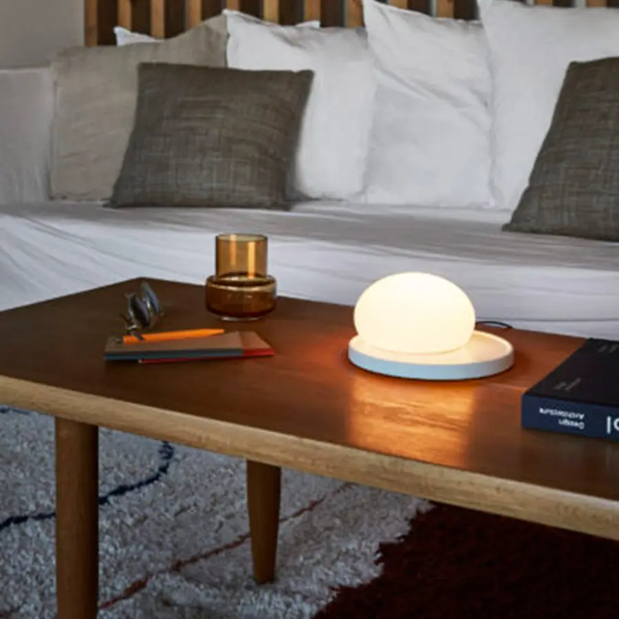 Base de acero lacado en la que se aloja la fuente de luz. Un difusor de vidrio soplado opal levemente magnetizado reposa encima de la base y se desplaza por la superficie. Interruptor ubicado en el lateral de la base