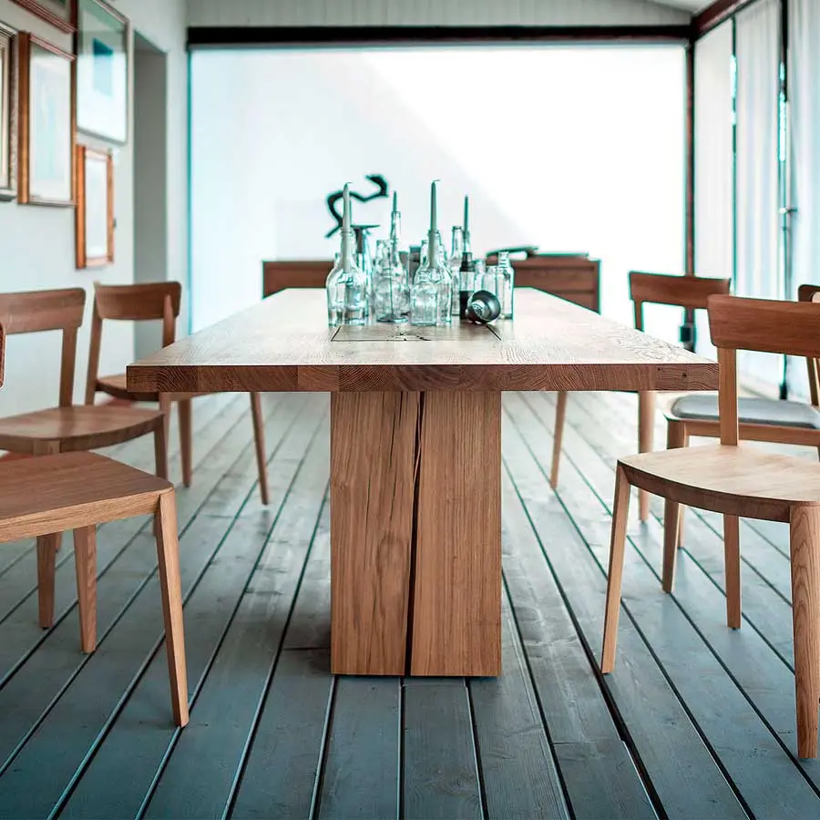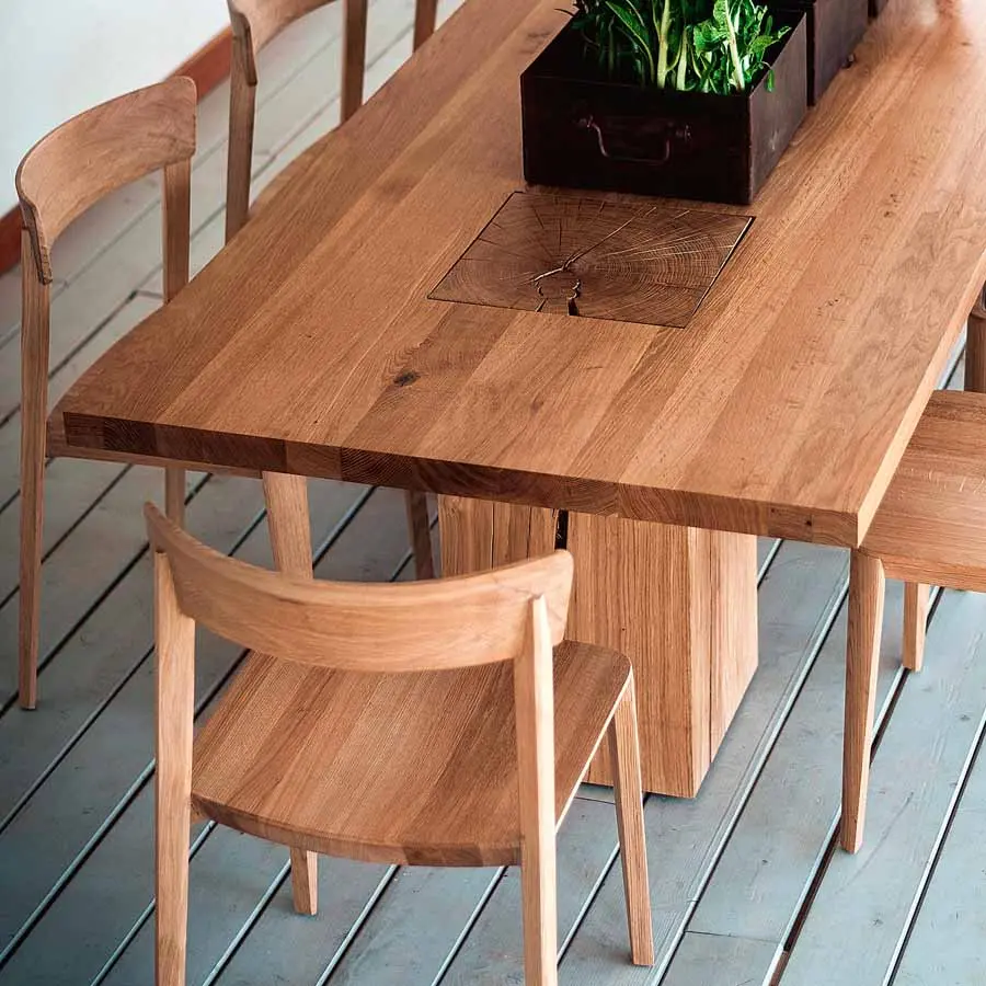 Mesa con tapa realizada en madera maciza en listones encolados, caracterizada por patas que cruzan la superficie superior, realizadas a partir de secciones de troncos de árboles. Versión con tapa rectangular y dos patas.