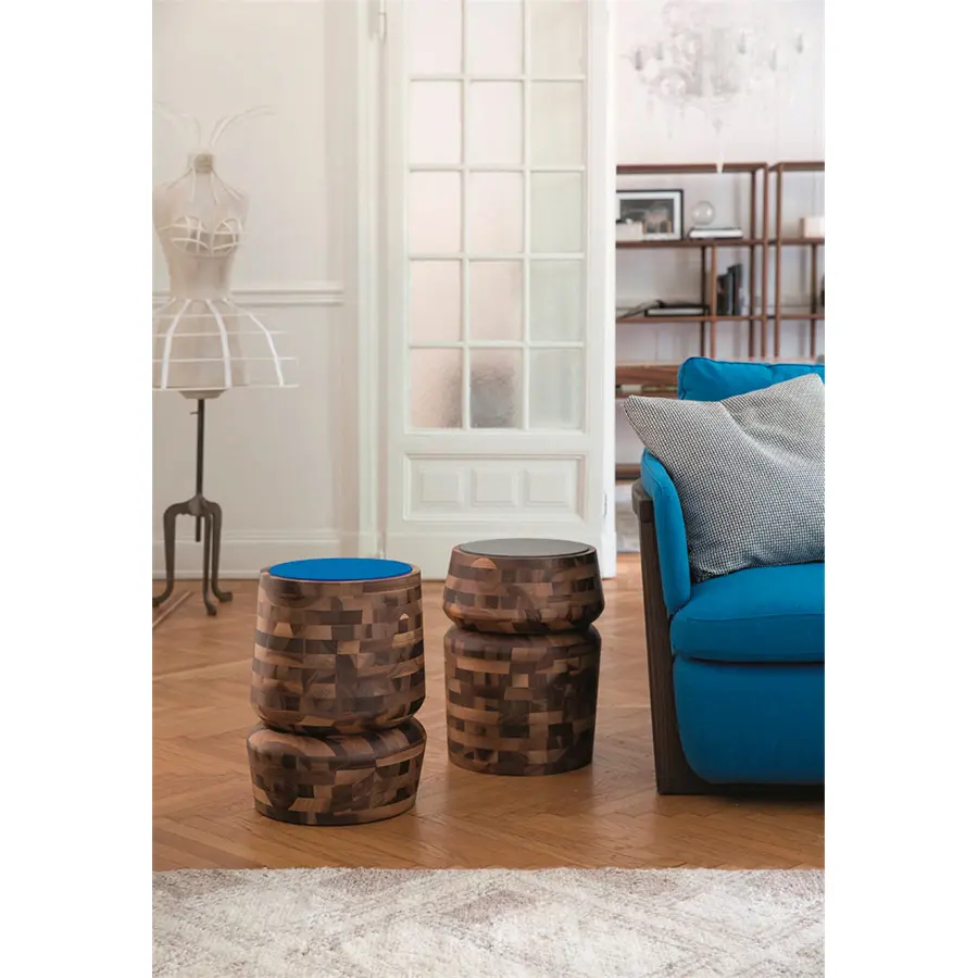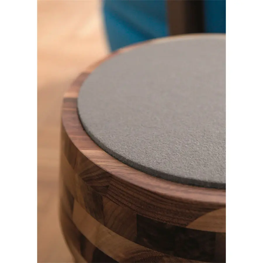 Taburete con estructura de nogal canaletta macizo e inserto en fieltro gris o azul.