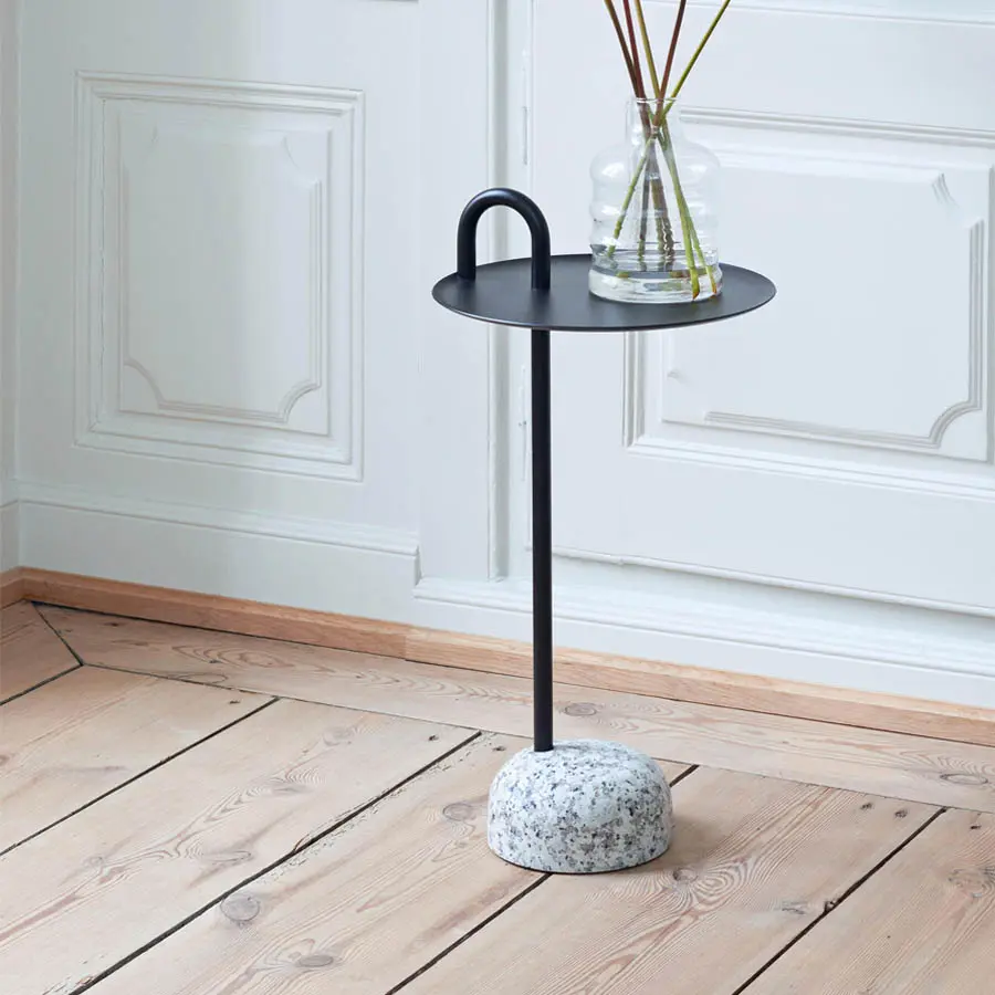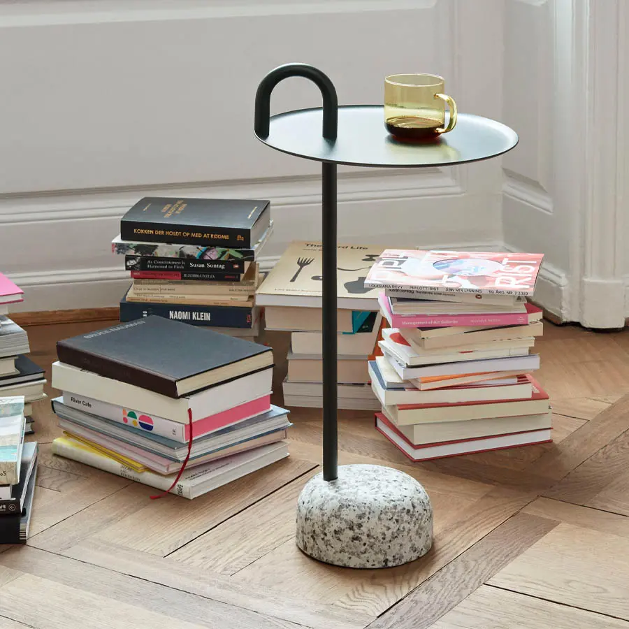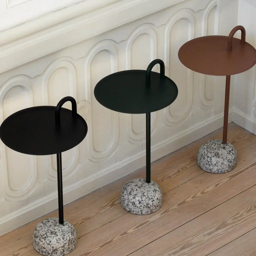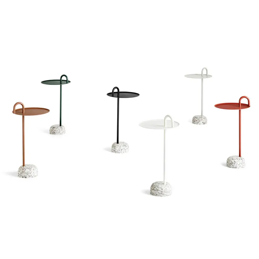 La mesa auxiliar Bowler de Shane Schneck es una mesa compacta ideal para espacios pequeños. El tubo único que se extiende hacia arriba crea un perfil definido, que también funciona como un asa funcional. El tallo, el asa y la bandeja están hechos de acero recubierto de polvo, con una base de granito sólido que proporciona estabilidad, pero que sigue siendo lo suficientemente ligera como para moverse fácilmente. Bowler se entrega desarmada y es fácil de montar, lo que la hace adecuada para todo tipo de entornos domésticos y corporativos.