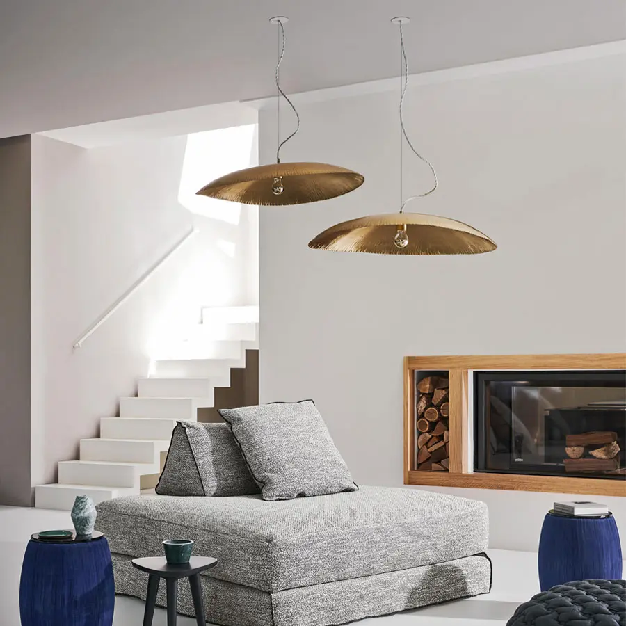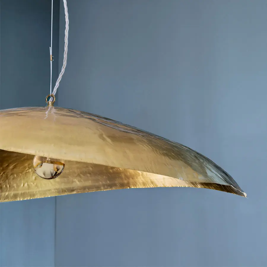 De fuerte impacto decorativo, la familia de lámparas BRASS explota la ductilidad del latón y su capacidad de embellecer los interiores con reflejos luminosos cálidos y dorados. Las lámparas colgantes tienen una forma delicada, de gran atractivo visual: un ligero disco de latón, con una ligera curvatura en la versión más pequeña o muy acentuada en la más grande, que flota en el aire, reflejando la luz en modo poético y sugerente. Pueden utilizarse individualmente o combinadas entre sí para lograr un efecto todavía más atractivo o escenográfico. Considerando la total artesanía del producto, es posible que con el tiempo aparezcan pequeñas manchas debido a la oxidación del latón. Estas manchas no hay que considerarlas defectos, sino una característica del material. Pequeñas marcas superficiales, rayones, arrugas, etc. se deben al proceso artesanal de martilleo sobre el latón y, por lo tanto, son característicos de la fabricación del producto.