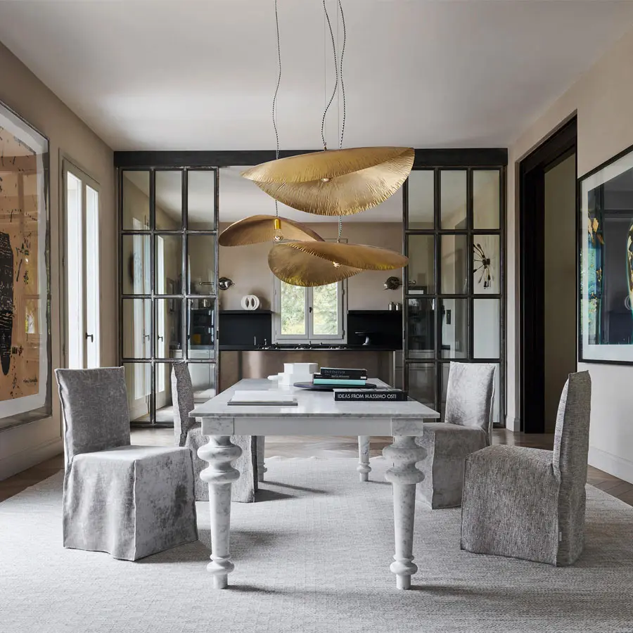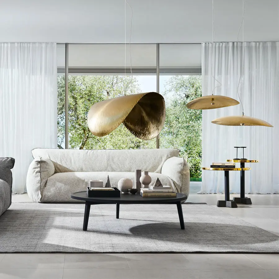 De fuerte impacto decorativo, la familia de lámparas BRASS explota la ductilidad del latón y su capacidad de embellecer los interiores con reflejos luminosos cálidos y dorados. Las lámparas colgantes tienen una forma delicada, de gran atractivo visual: un ligero disco de latón, con una ligera curvatura en la versión más pequeña o muy acentuada en la más grande, que flota en el aire, reflejando la luz en modo poético y sugerente. Pueden utilizarse individualmente o combinadas entre sí para lograr un efecto todavía más atractivo o escenográfico. Considerando la total artesanía del producto, es posible que con el tiempo aparezcan pequeñas manchas debido a la oxidación del latón. Estas manchas no hay que considerarlas defectos, sino una característica del material. Pequeñas marcas superficiales, rayones, arrugas, etc.  se deben al proceso artesanal de martilleo  sobre el latón y, por lo tanto, son característicos de la fabricación del producto.