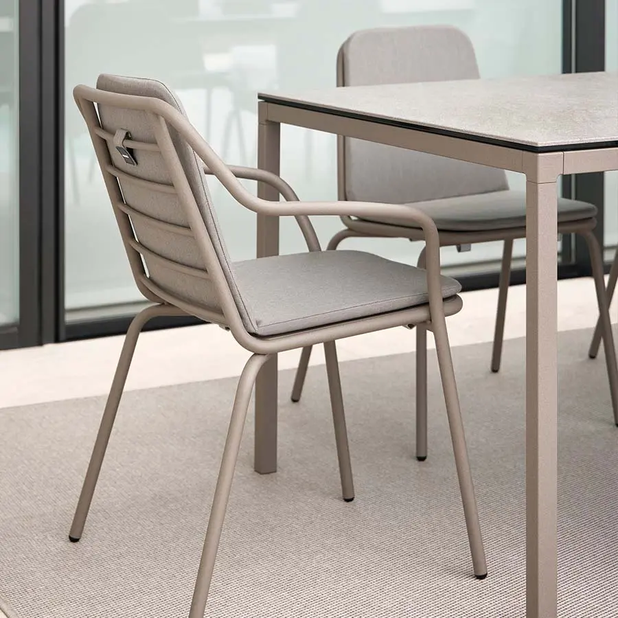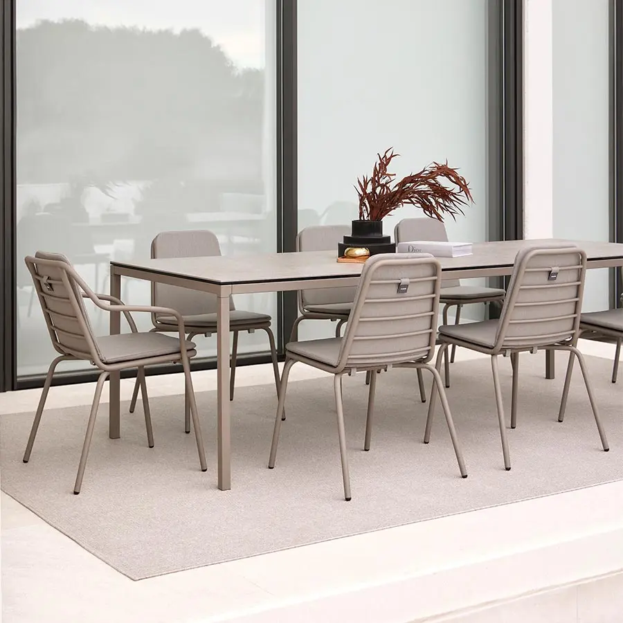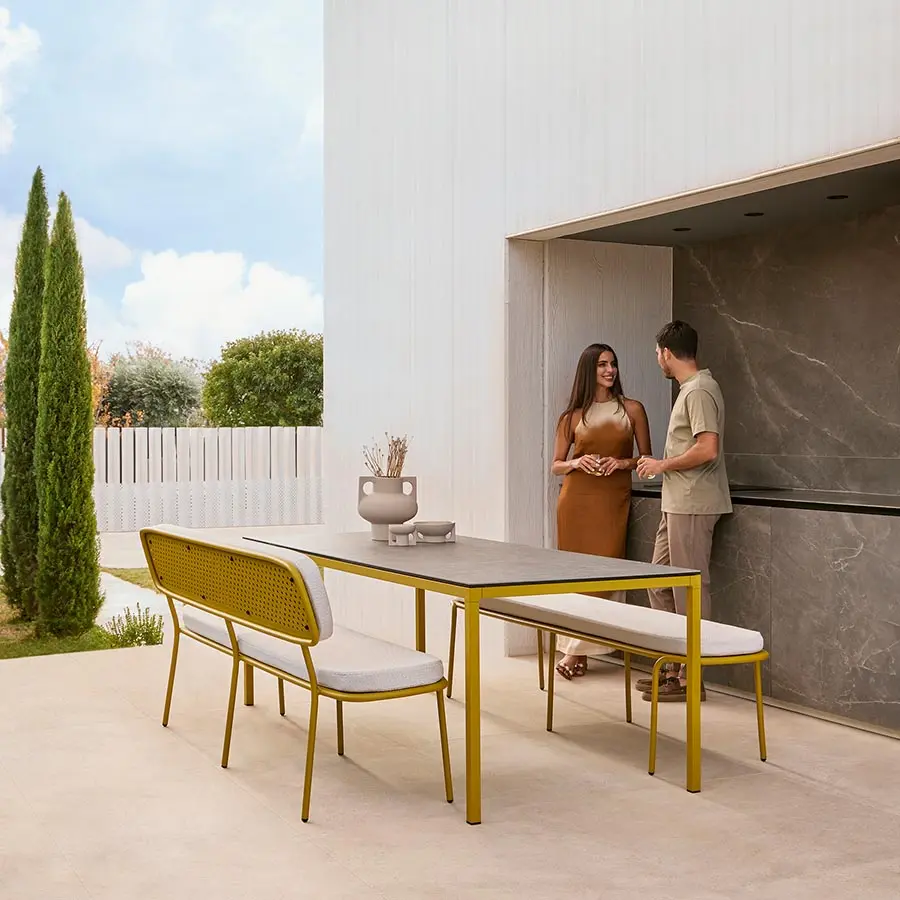 La colección de mesas fijas y auxiliares Brise destaca por la elegancia y calidad de sus materiales. La tapa de estas mesas está elaborada con porcelánico técnico laminado con cristal, fusionando así durabilidad y estética. Este innovador material no solo añade un toque de sofisticación, sino que también facilita la limpieza y asegura una resistencia excepcional a lo largo del tiempo.