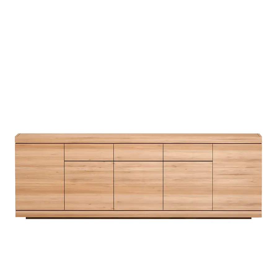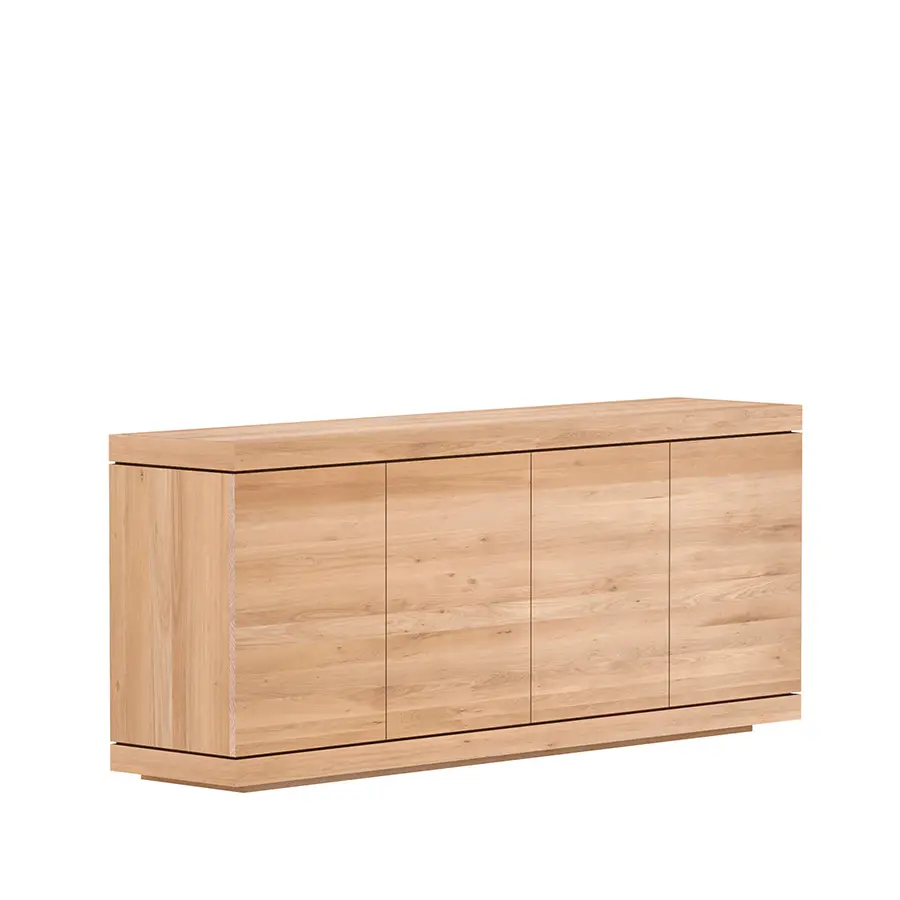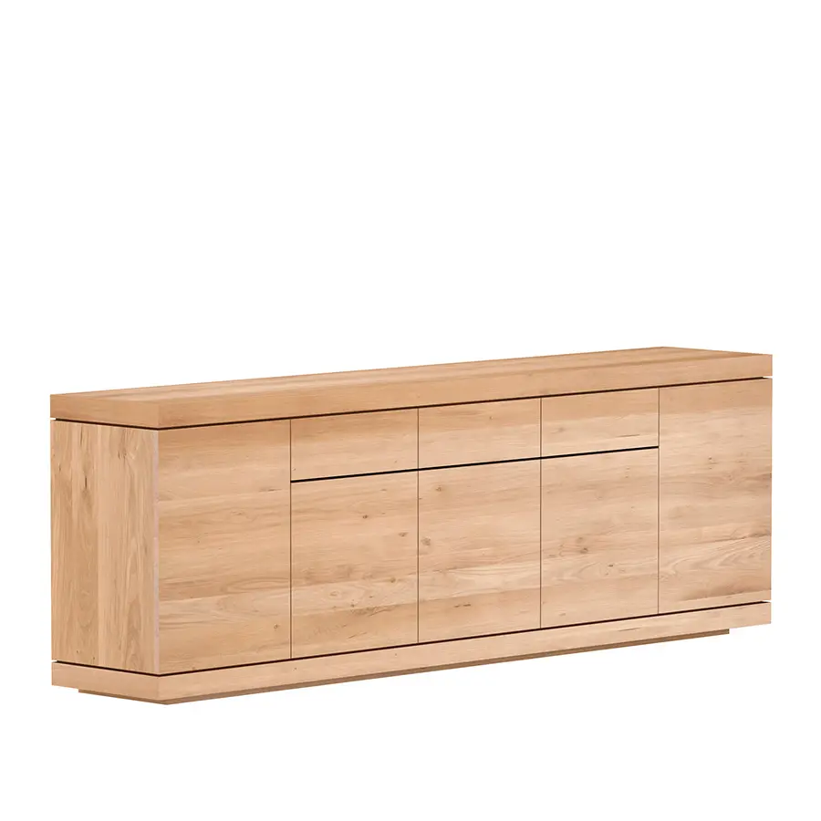 El aparador Burger es una construcción sólida con amplio espacio de almacenamiento. La tapa y la base están formadas por dos piezas robustas, y los laterales están abiertos. Esto recuerda a una hamburguesa y por eso lleva ese nombre. Disponible en diferentes formatos, con puertas o combinando puertas y cajones.