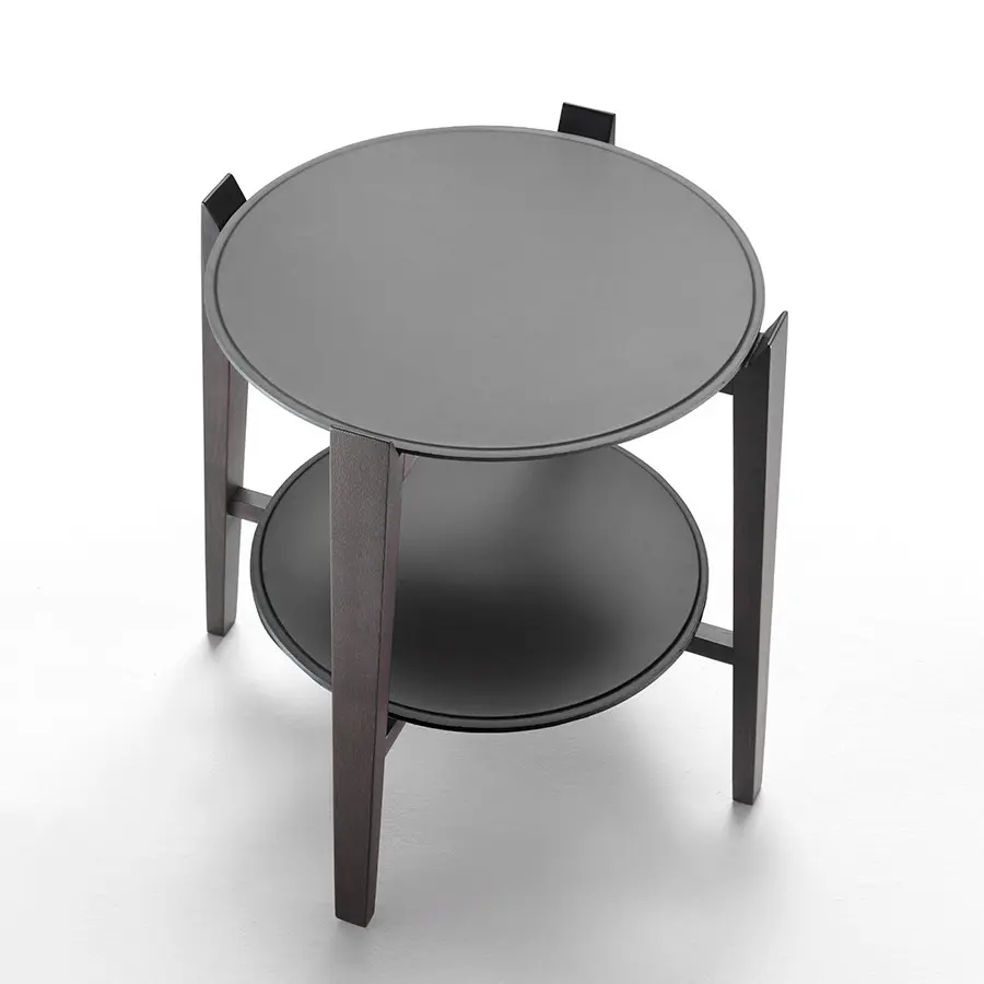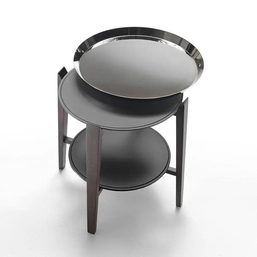 Tan elegante como funcional, Cabaré es una mesa de centro que se puede usar en combinación con todos los asientos de la colección Flexform. De forma redonda, tiene una estructura refinada de madera maciza –nogal americano o fresno en una variedad de acabados– y dos tableros superpuestos en metal recubierto de cuero: la inferior puede ser útil para colocar libros o revistas. El nivel superior está coronado por una práctica bandeja extraíble, de la cual toma su nombre la mesa de centro Cabaré. La bandeja está hecha de metal en los acabados satinado, cromado, bruñido, cromado negro y champán, y hace de Cabaré un auténtico comodín en la sala de estar.