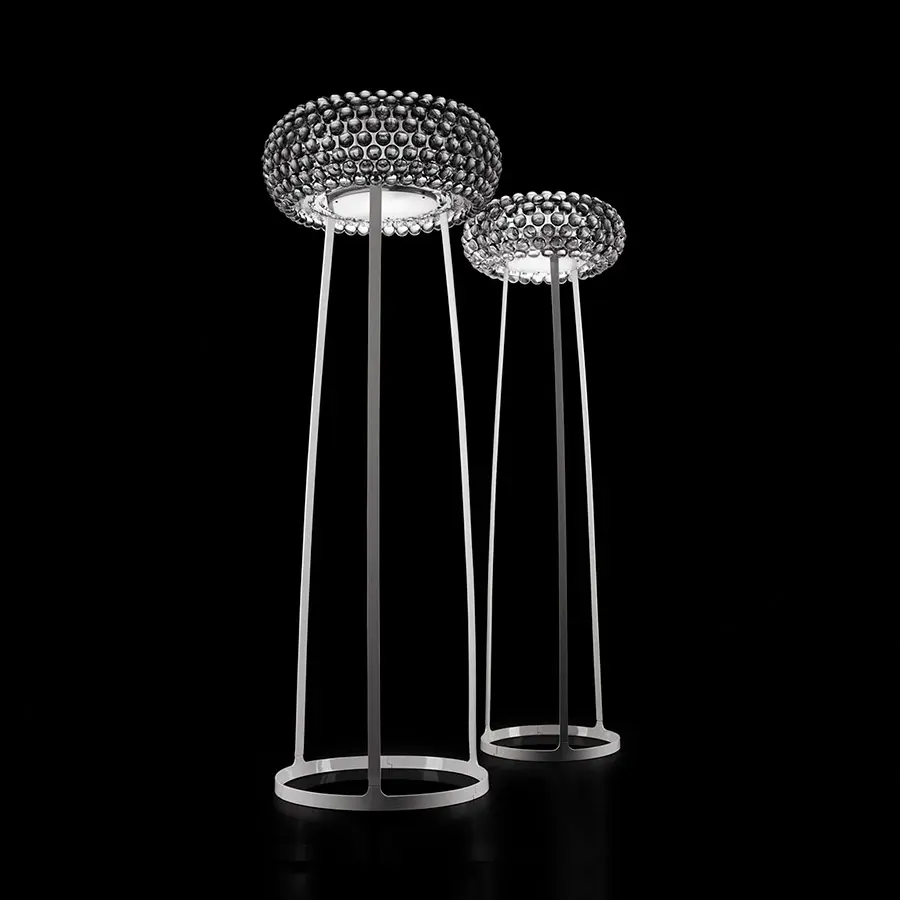 Lámpara de pie de luz difusa, directa e indirecta. Difusor interno en vidrio soplado satinado, escudo inferior de vidrio opalino satinado. Rica, brillante y sofisticada, la lámpara Caboche es un mosaico de refracciones, una fusión perfecta en una única forma de diversas individualidades que realizan en su conjunto el cuerpo y el efecto luminoso de la lámpara. Cuando está encendida, la luz se propaga desde el interior de las esferas como si se tratara de cristales luminosos, iluminando el ambiente a 360° y garantizando al mismo tiempo una iluminación hacia arriba y hacia abajo. Caboche de tierra es una pequeña joya de creatividad y de tecnología que se encuentra disponible en dos medidas y en dos versiones: transparente y amarillo oro.